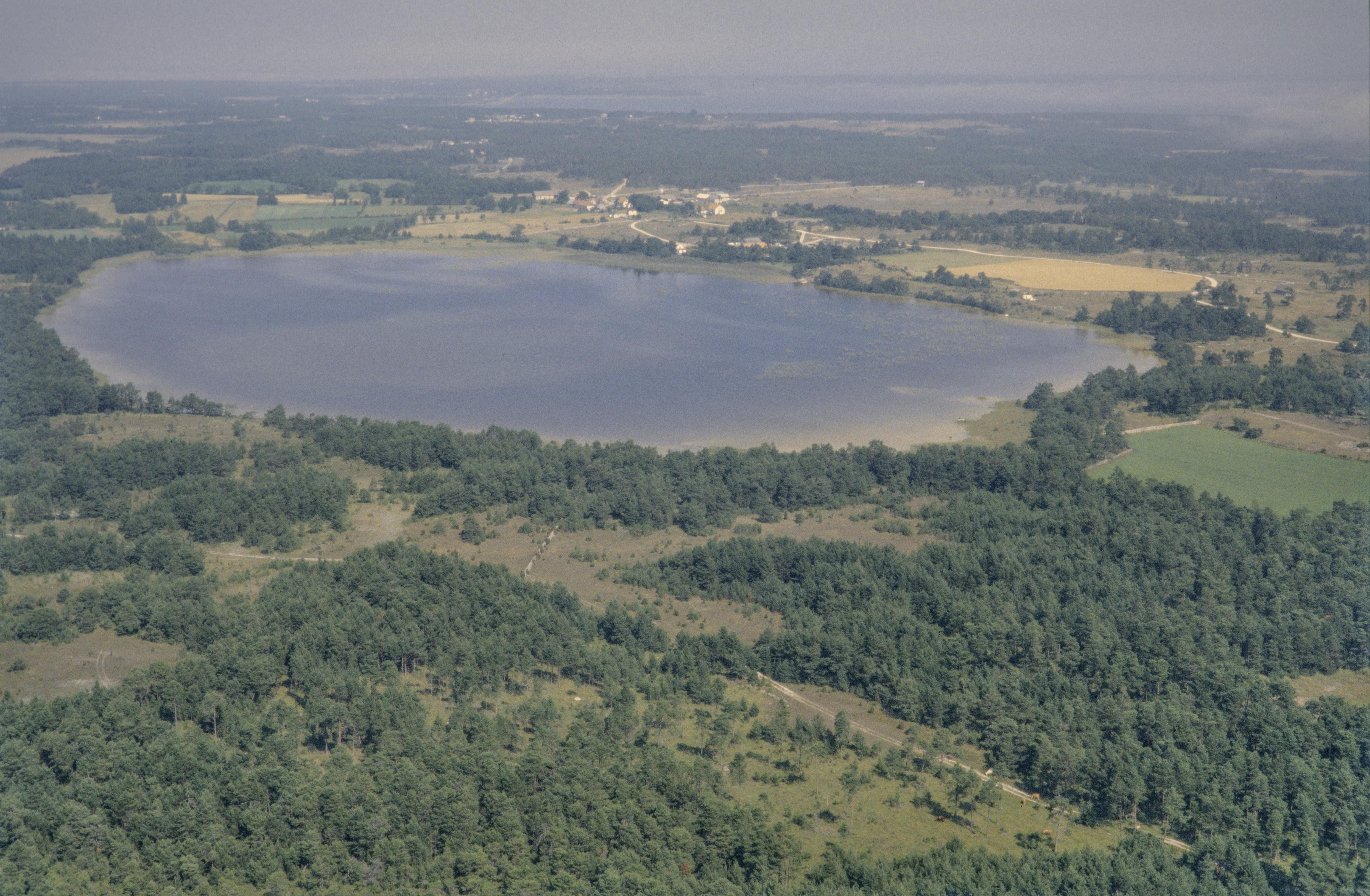 Beskrivning: Sjön Dämbaträsk. I skogen under bildens mitt (vid sjön södra ände) hägnad RAÄnr Fårö 254:1. I bildens övre del Dämba by, Bilden är tagen mot (väderstreck): NNO