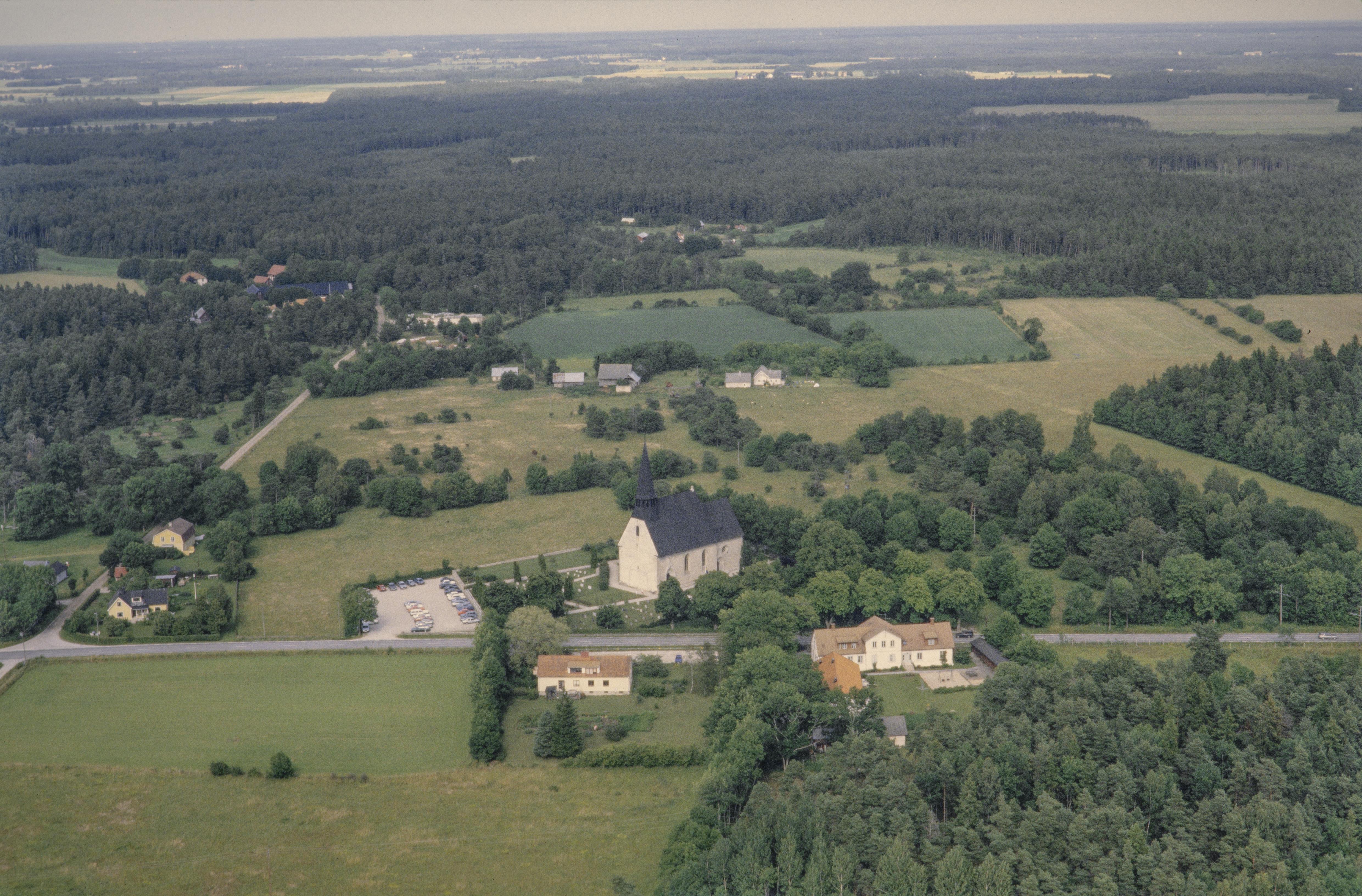 Beskrivning: Väte kyrka och kyrkby. I bildens nedre kant fornborg RAÄnr Väte 89:1. Till höger om kyrkan bytomt RAÄnr Väte 90:1. Bilden är tagen mot (väderstreck): NO