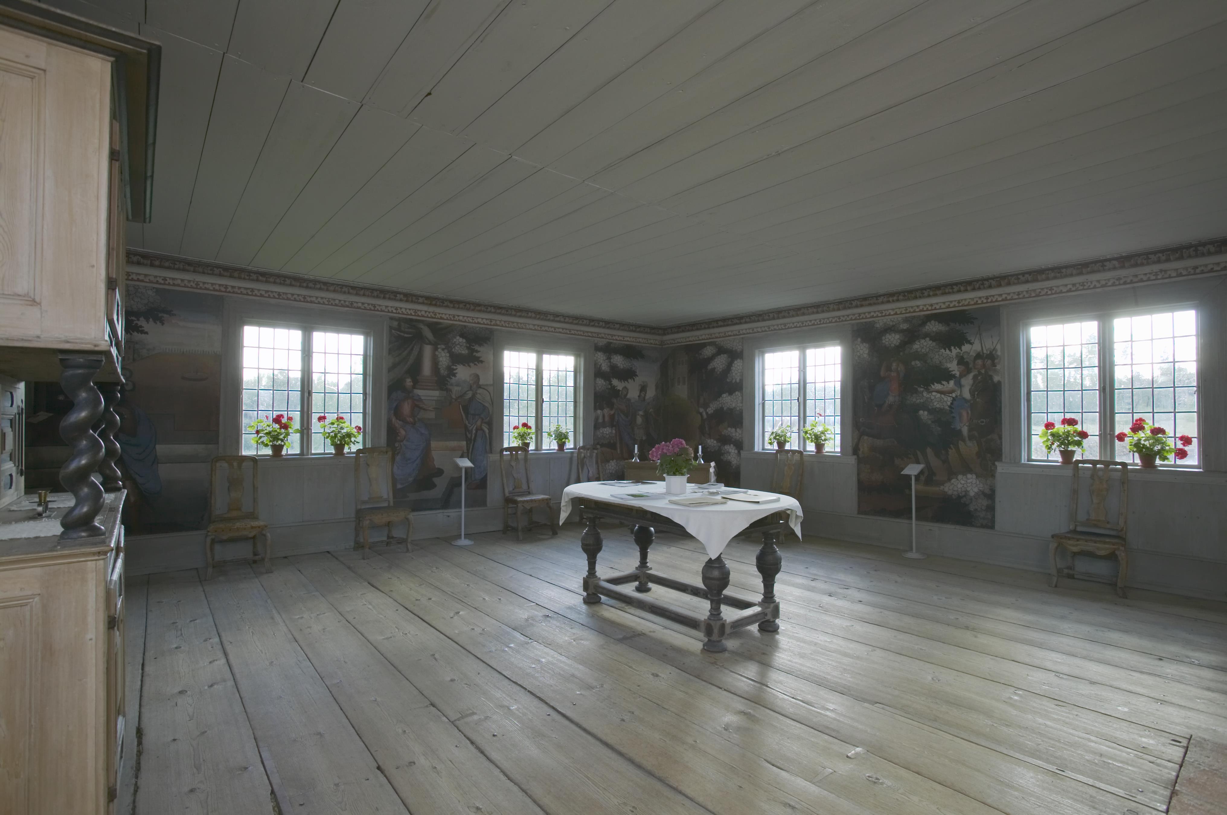 Beskrivning: Linnés bröllopsstuga, stora salen med barockmålningar på väv.