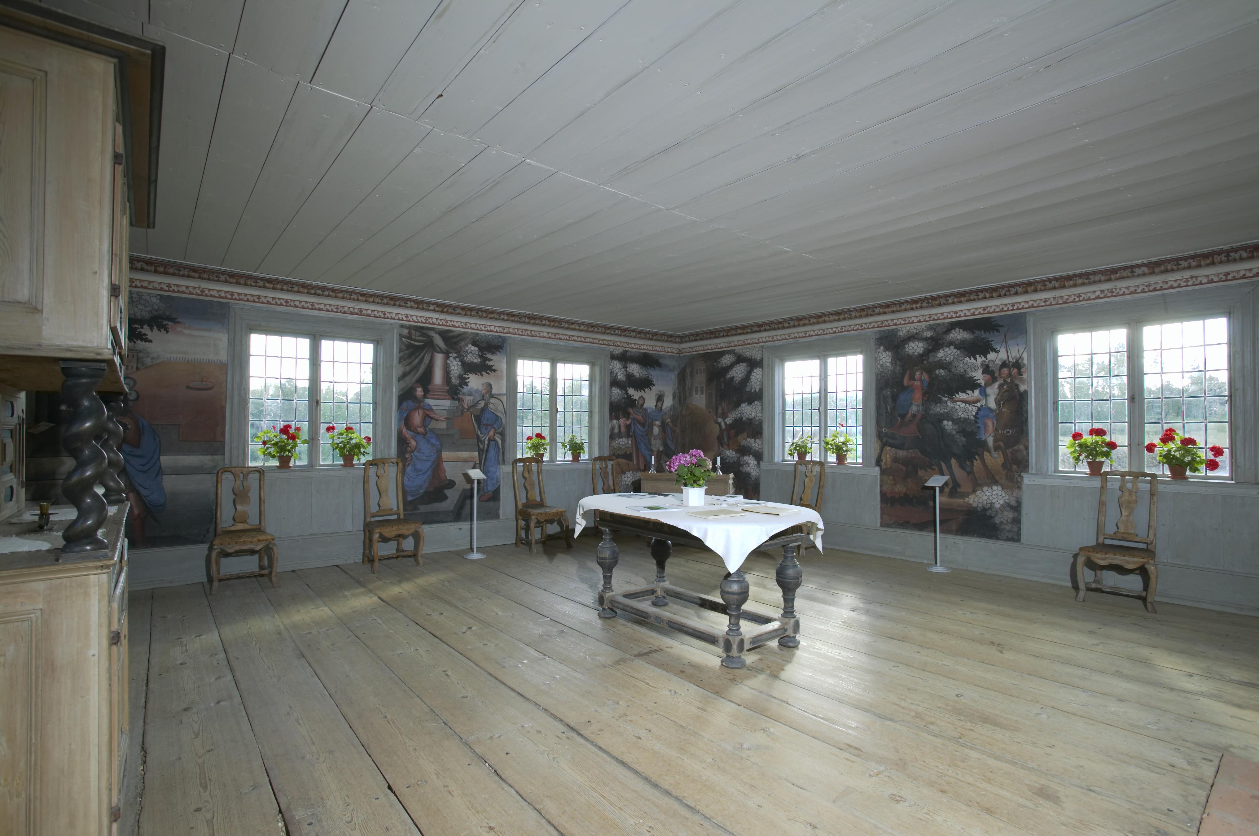 Beskrivning: Linnés bröllopsstuga, stora salen med barockmålningar på väv.
