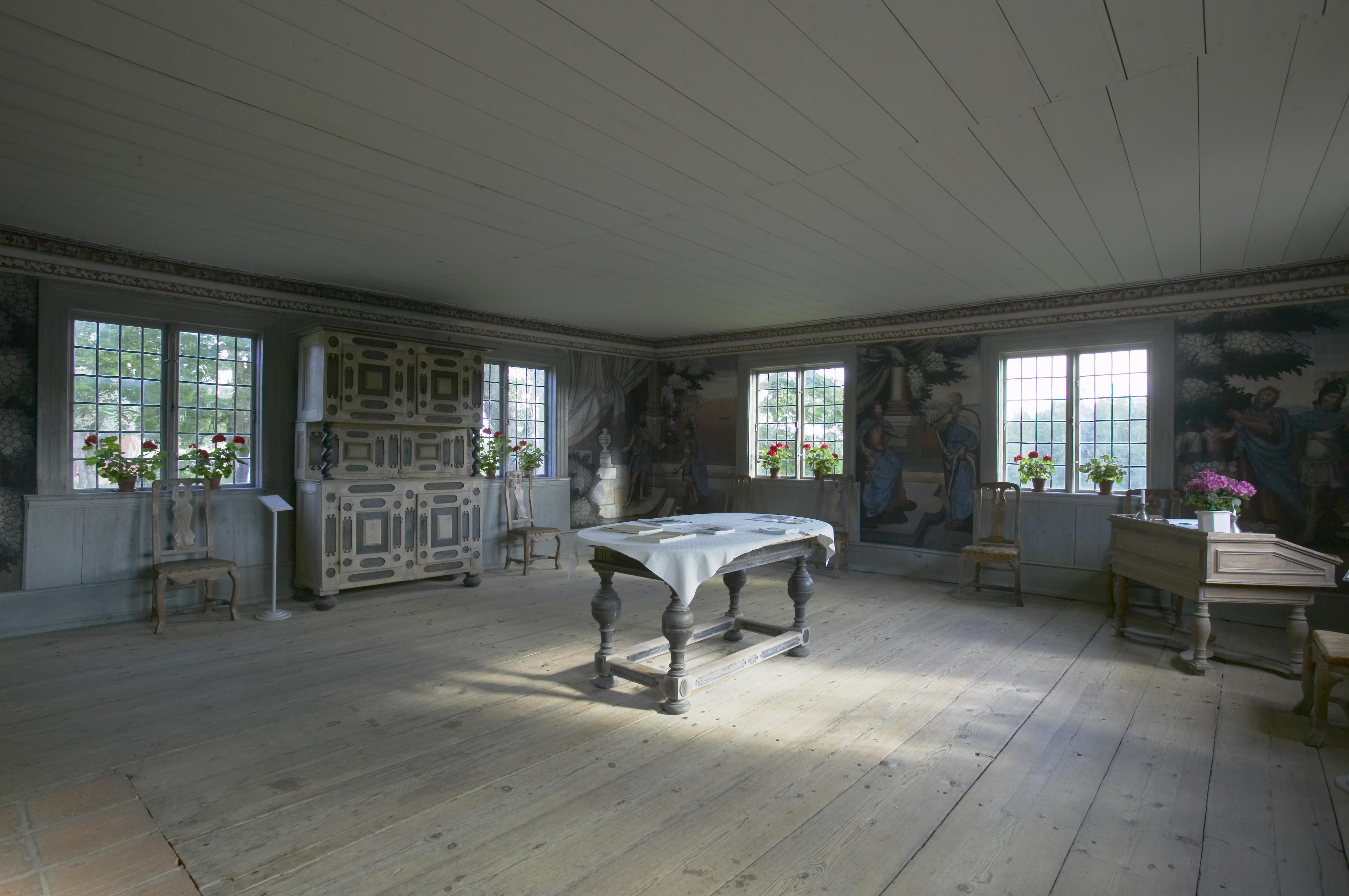 Beskrivning: Linnés bröllopsstuga, stora salen med barockmålningar på väv.