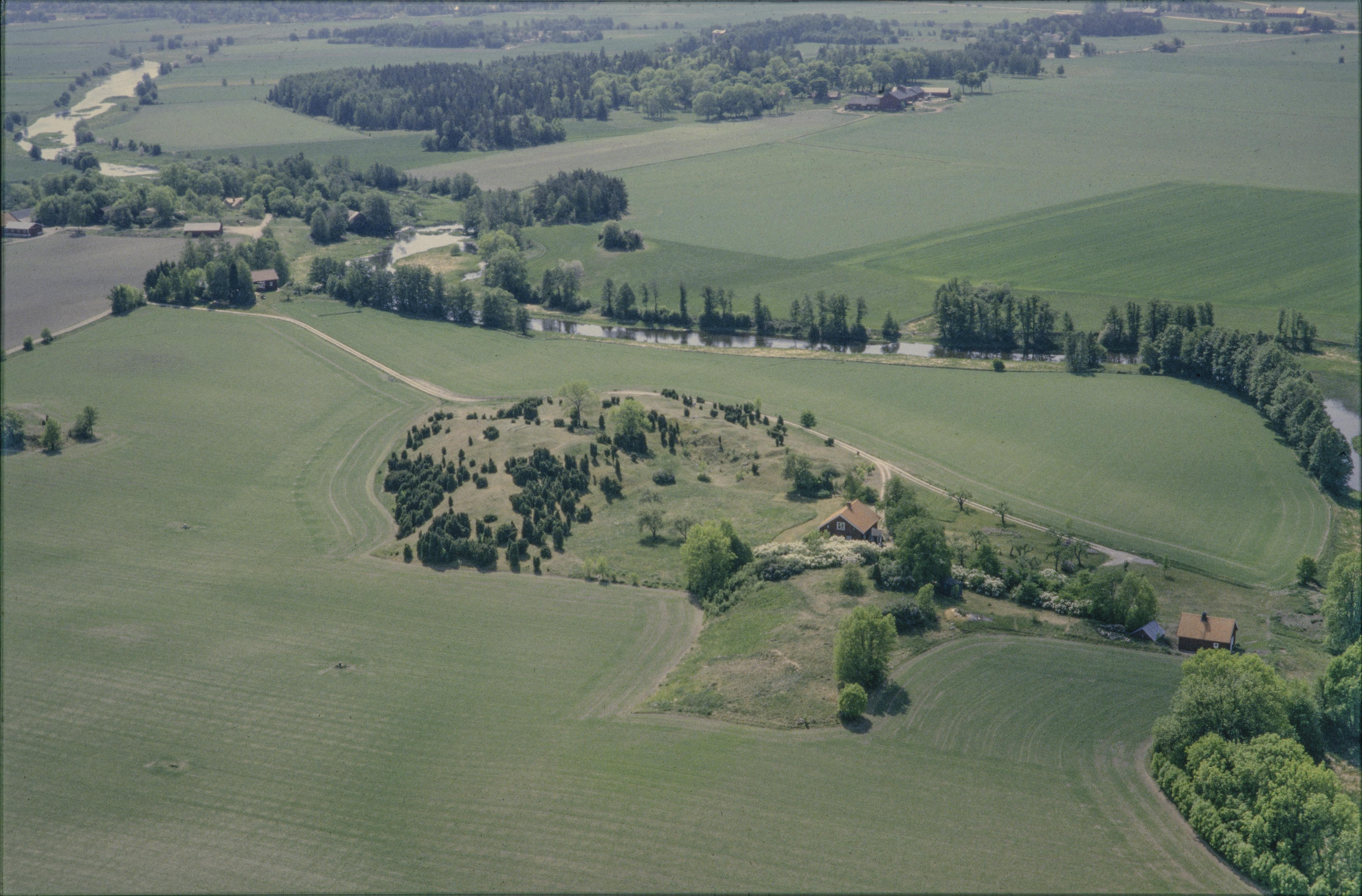 Beskrivning: Fyrisåns dalgång. Ån markerar gränsen mot socknet Bälinge (i bildens övre del). Vid bildens mitt Valsgärde (skrivs även Vallsgärde) gravfält RAÄnr Uppsala 209:1. Bilden är tagen mot (väderstreck): S