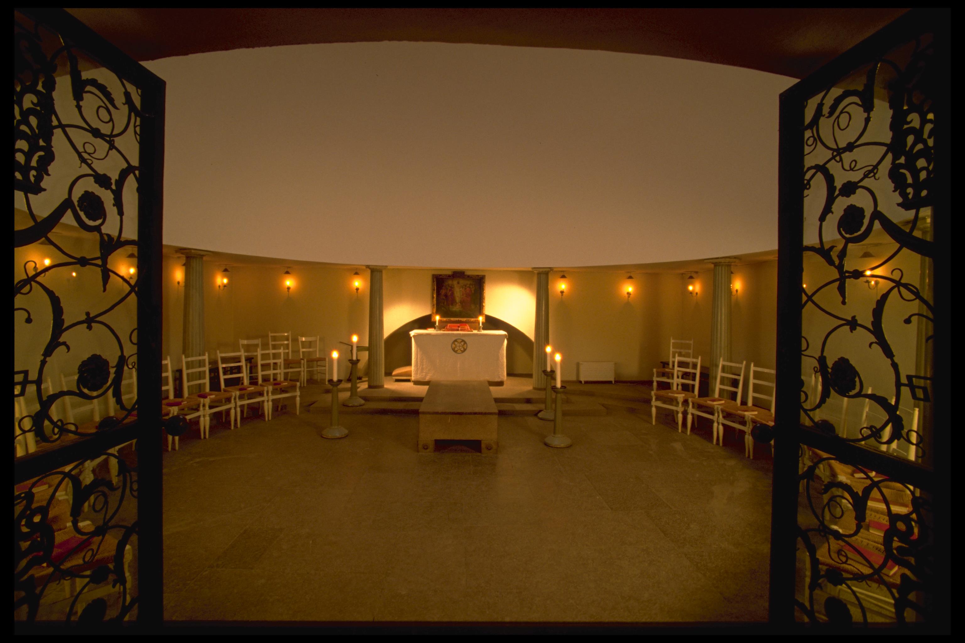 Beskrivning: Skogskapellet. Interiör, från ingången med dörrgrindar mot altaret.