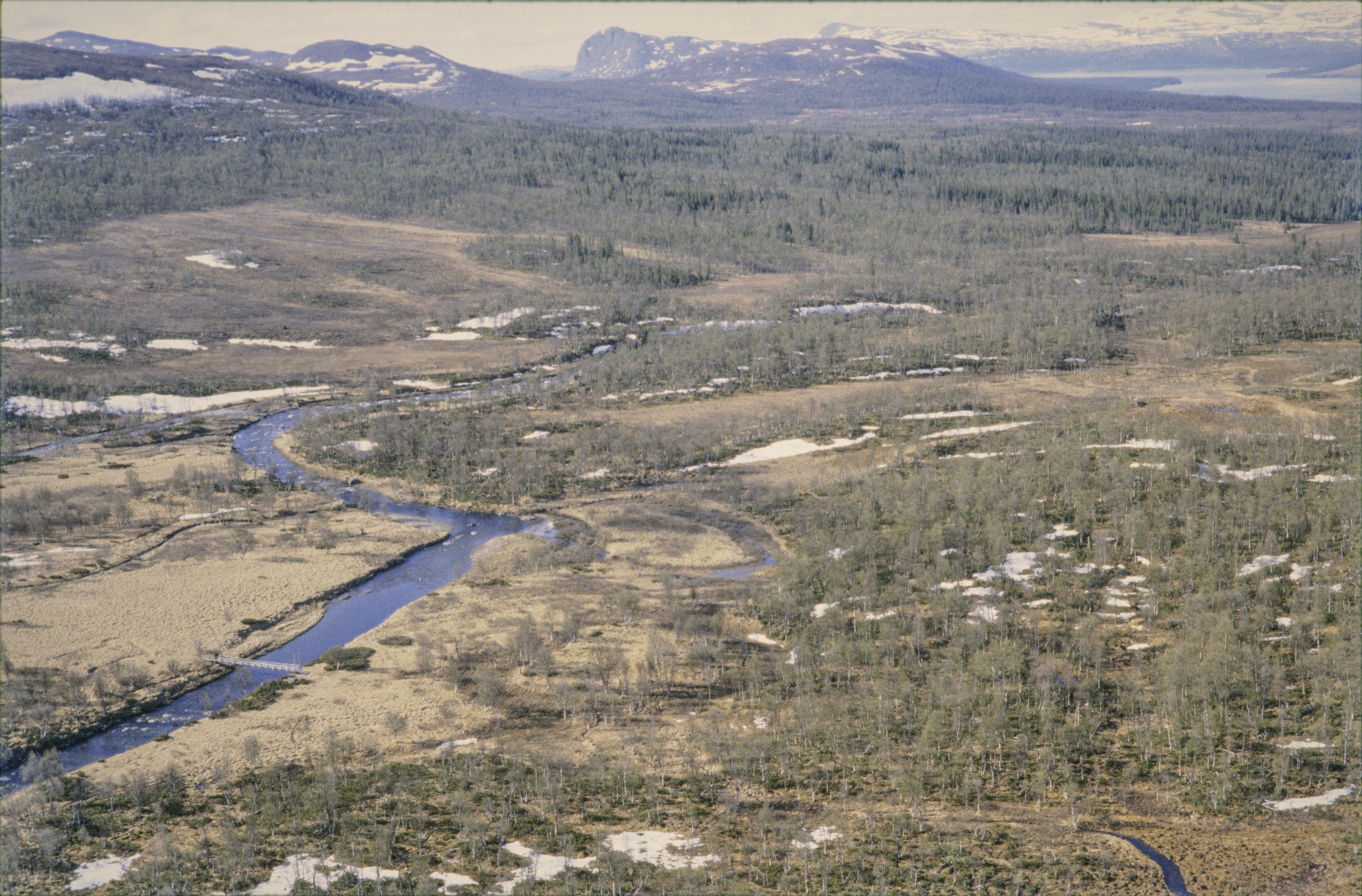 Beskrivning: Svartsjöbäcken (Tjeehpesjohke) i dalgången mot Kultsjön. Vid bildens mitt flöder den samman med Djupbäcken (till vänster) från Marsfjället. Uppe till vänster härd RAÄnr Vilhelmina 1541:1-4 m.fl. Ingår i Marsfjällets naturreservat. Bilden är tagen mot (väderstreck): SSV