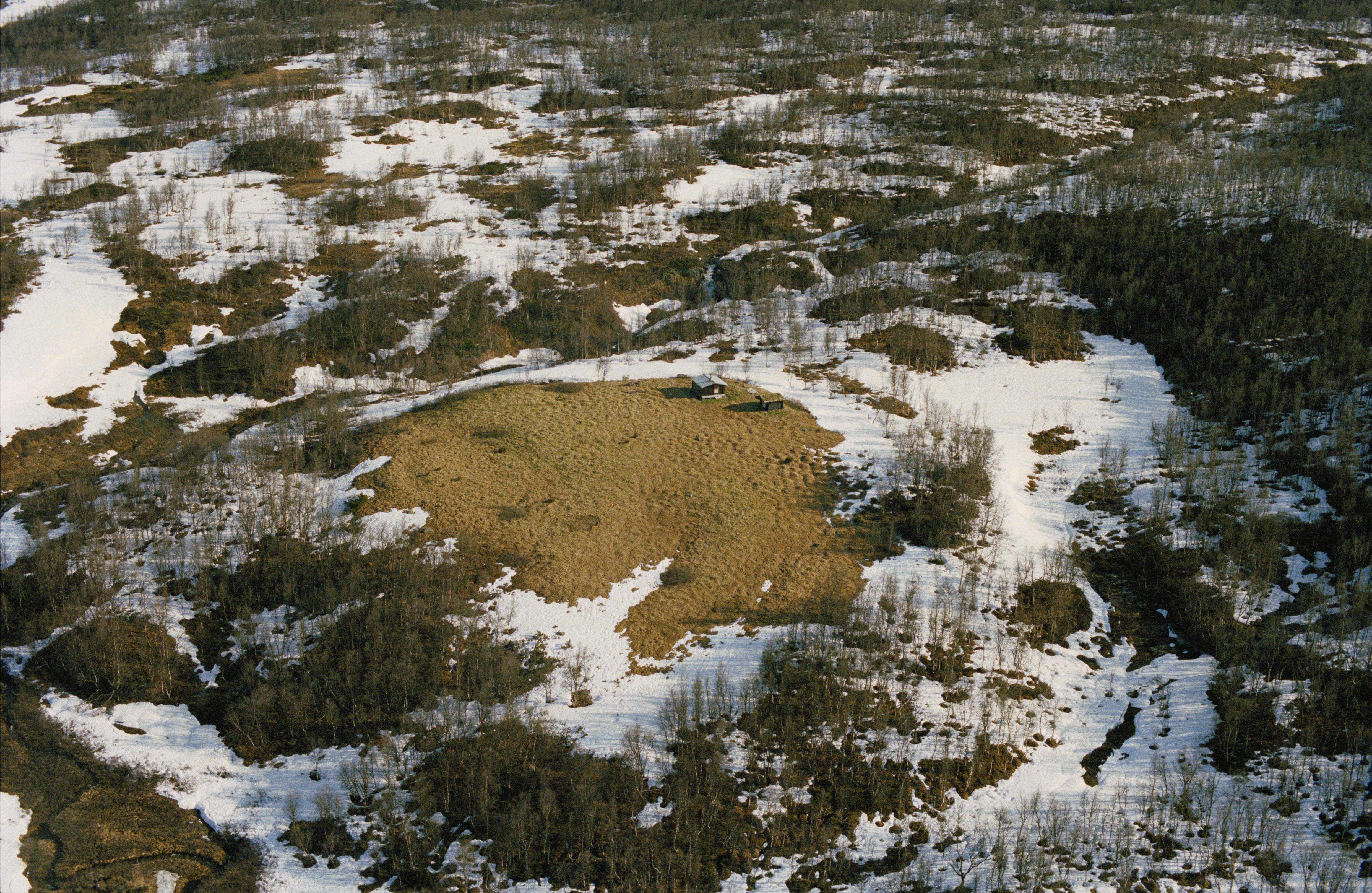 Beskrivning: Remdalen (Tjoelmenvaegkie). Sameviste med två byggnader i dalsidan vid bäcken Vaegkiejohke, på östsidan av området med stalotomter (hyddbottnar) RAÄnr Vilhelmina 14:1 (ej i bilden). Bilden är tagen mot (väderstreck): N