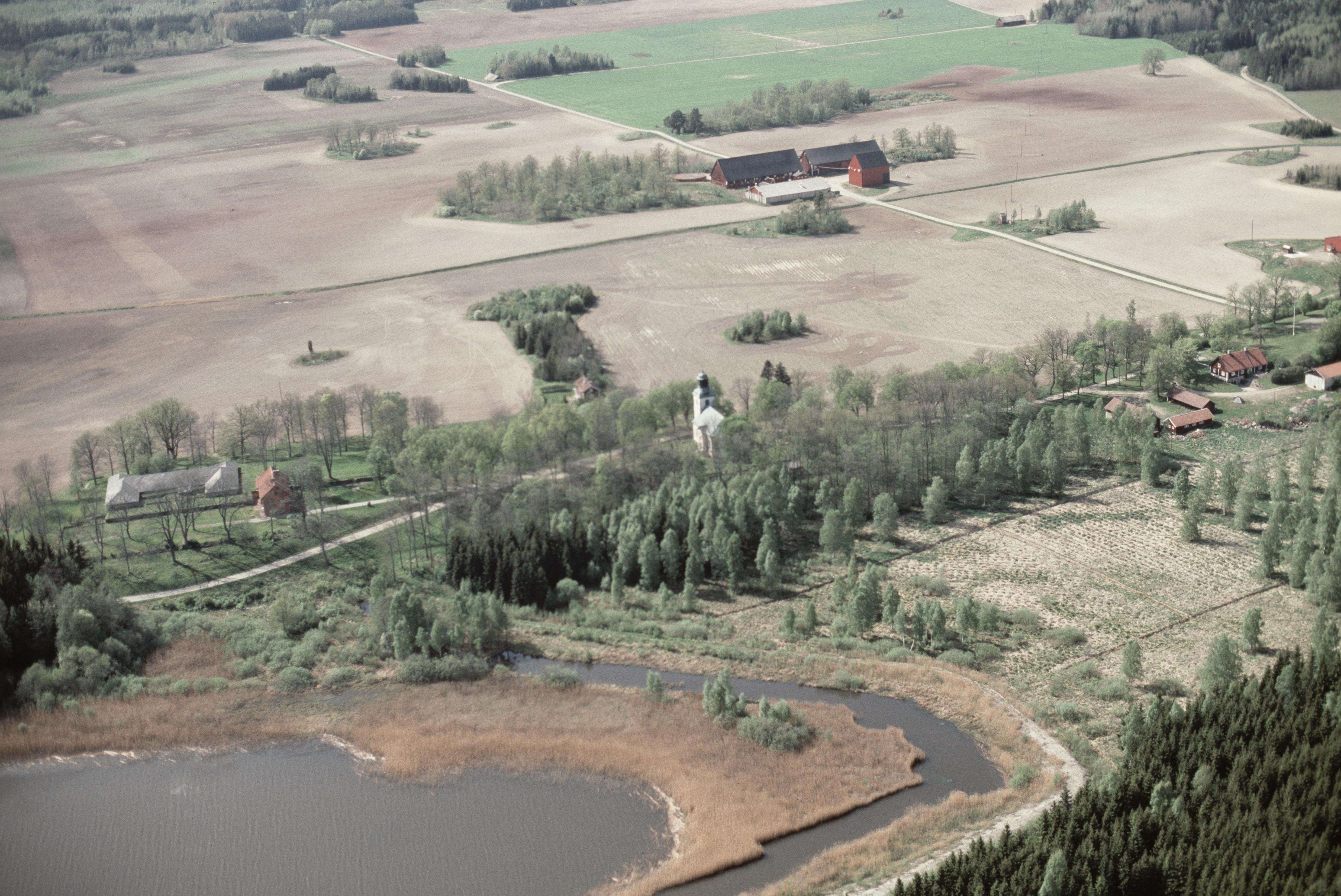 Beskrivning: Från vänster slottsruin Kägleholm RAÄnr Ödeby 8:1 (under grått skiffertak), Ödeby kyrka och Kägleholms herrgård / säteri vid sjön Väringen. Bilden är tagen mot (väderstreck): NV