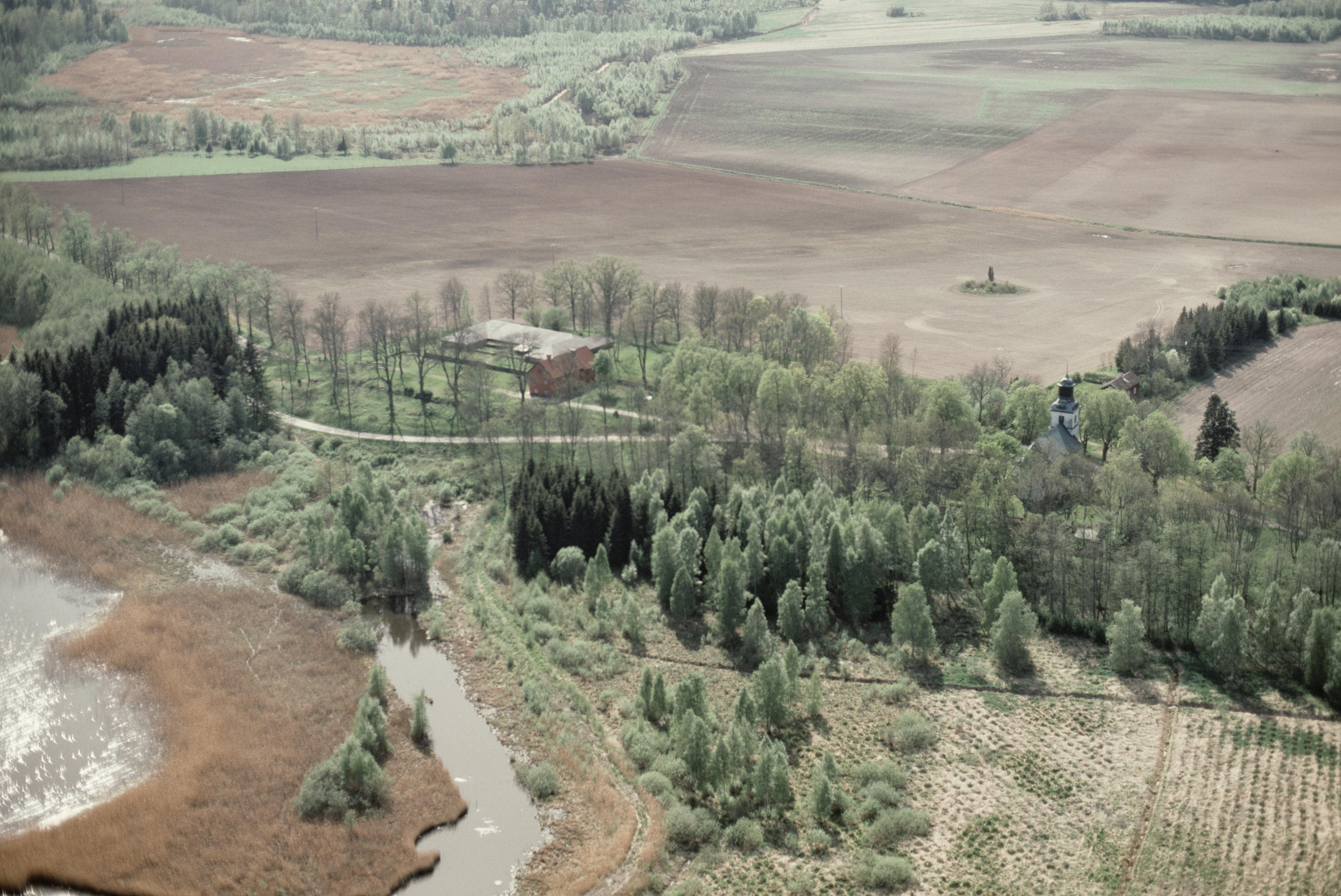 Beskrivning: Från vänster slottsruin Kägleholm RAÄnr Ödeby 8:1 (under grått skiffertak) och Ödeby kyrka vid sjön Väringen. Bilden är tagen mot (väderstreck): VSV