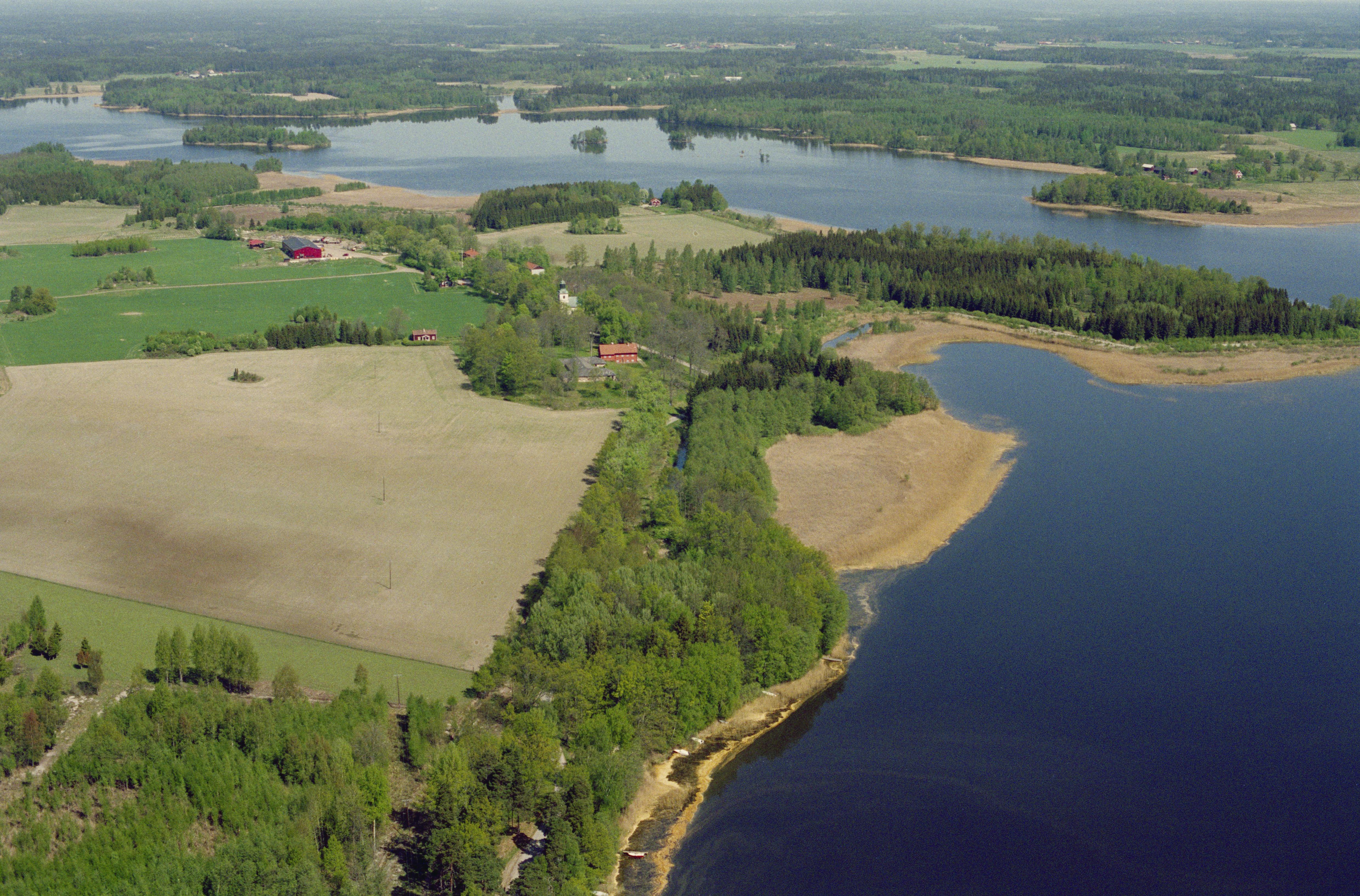 Beskrivning: Sjön Väringen. I bildens övre del slottsruin Kägleholm RAÄnr Ödeby 8:1 (under grått skiffertak), Ödeby kyrka och Kägleholms herrgård / säteri. Bilden är tagen mot (väderstreck): NNO