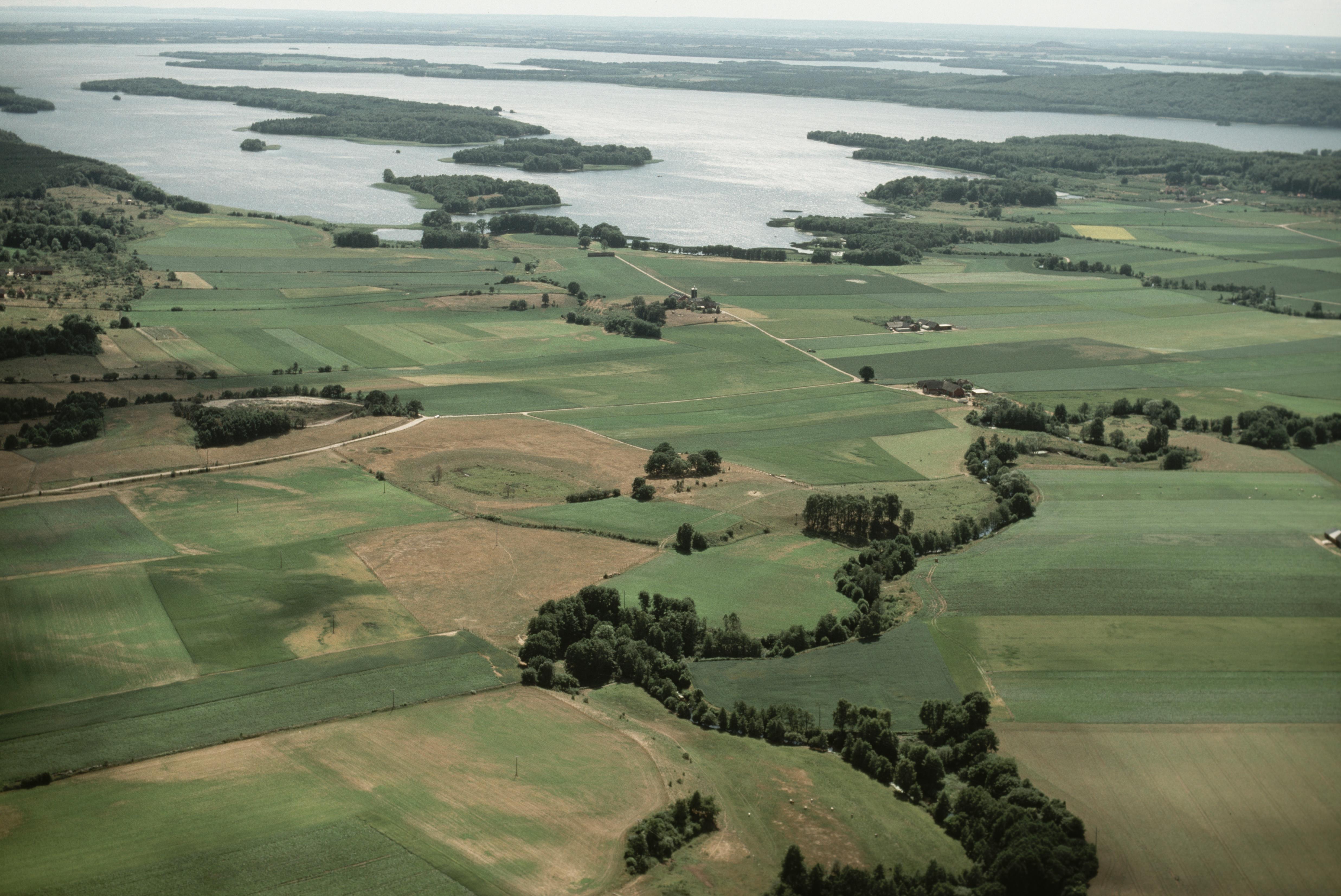 Beskrivning: Gravfält Näsums gudahage RAÄnr Näsum 5:1 vid Holjeån. I bildens övre del Ivösjön. Bilden är tagen mot (väderstreck): SSV