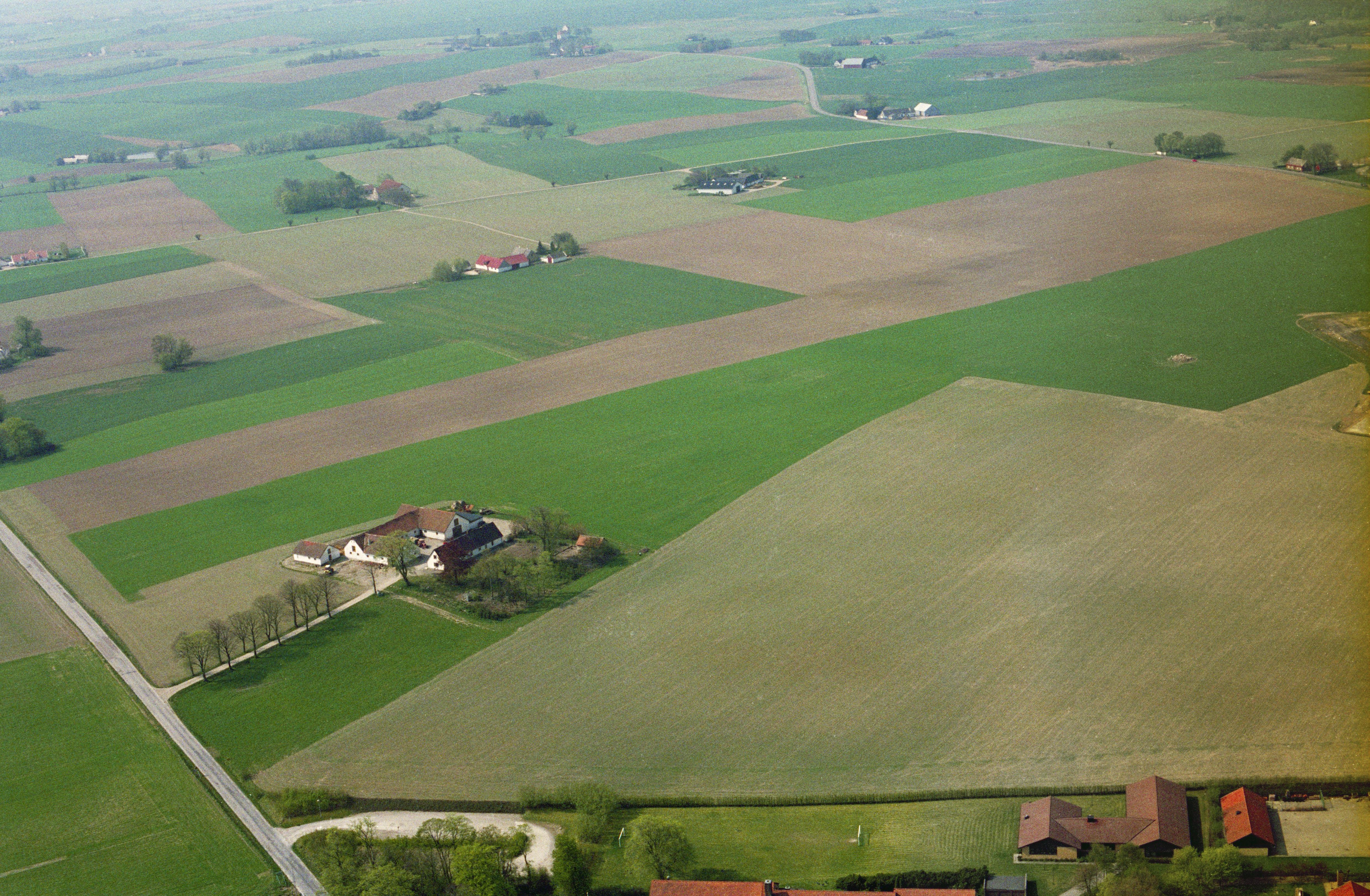 Beskrivning: MacLeans åkrar i området vid Saritslöv. I bildens nedre del Kyrkogatan söder i tätorten Skurup. Bilden är tagen mot (väderstreck): NV