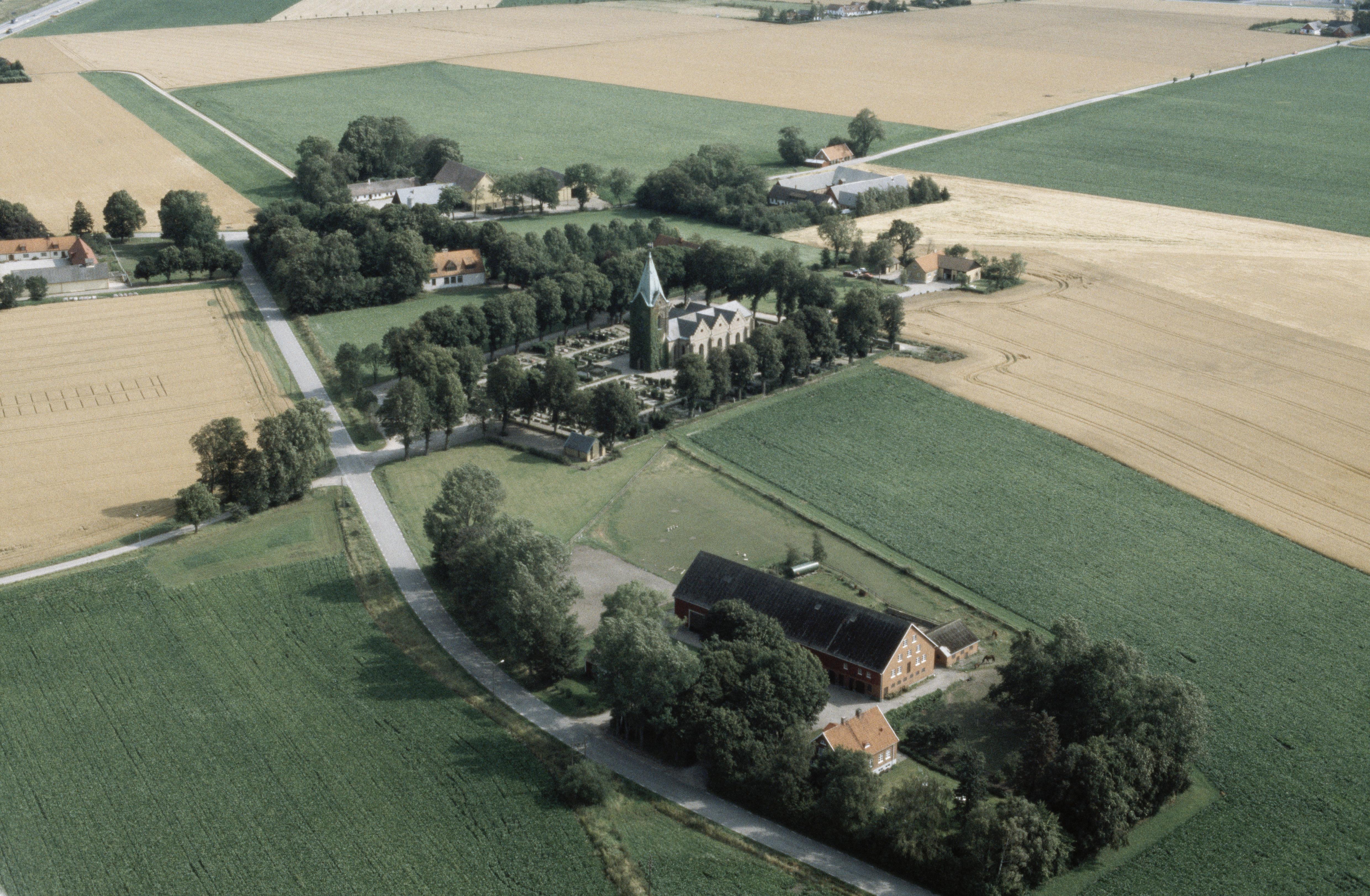 Beskrivning: Uppåkra kyrka vid bildens mitt. Nere till höger Lillehög och Storehög RAÄnr Uppåkra 3:1 och 4:1, boplats Uppåkra 5:1 m.fl.. Bilden är tagen mot (väderstreck): NO