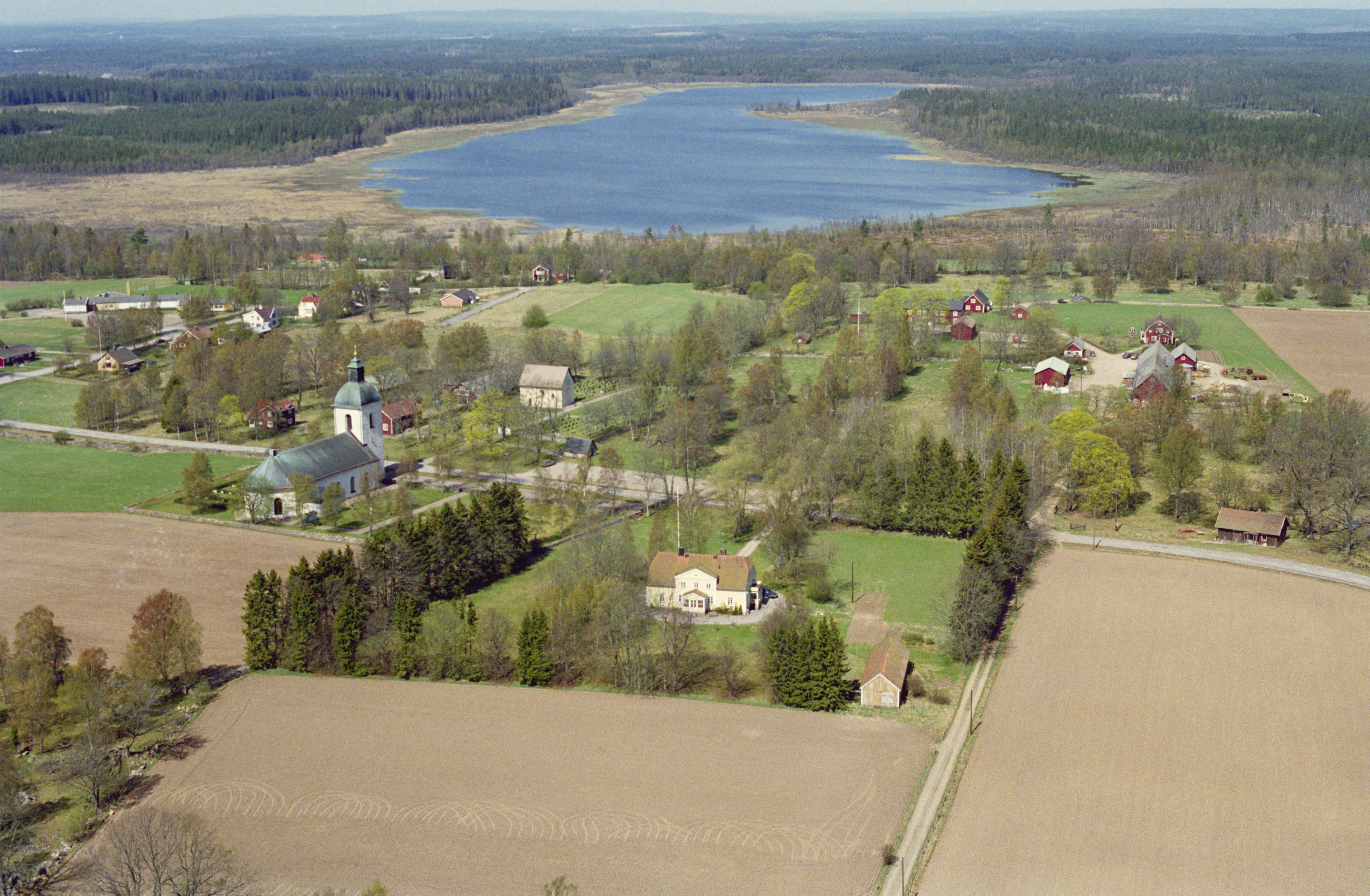 Beskrivning: Dädesjö gamla kyrka och Dädesjö nya kyrka. I bildens övre del sjön Dällingen. Bilden är tagen mot (väderstreck): NV