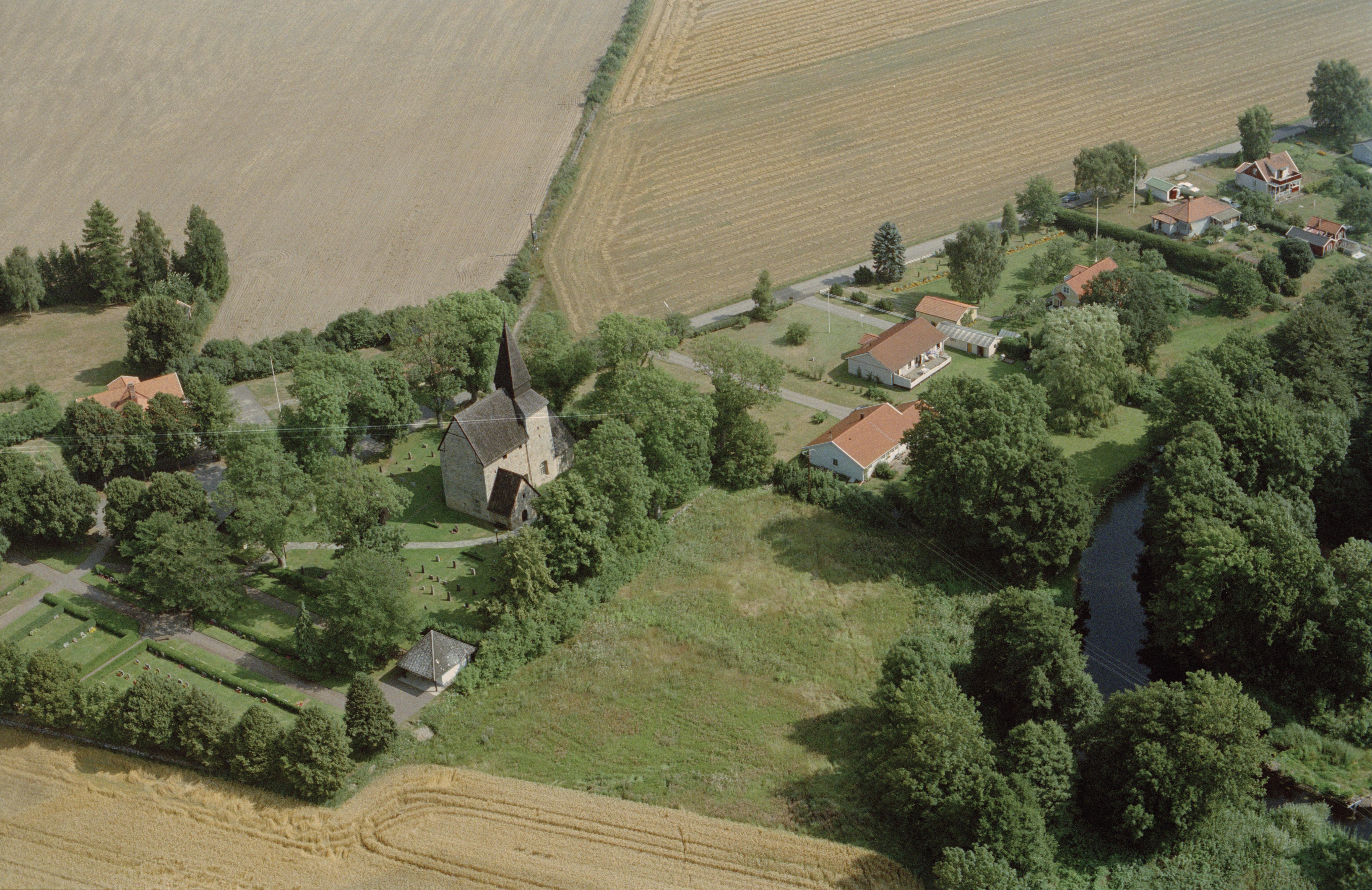 Beskrivning: Hossmo kyrka och kyrkby vid Ljungbyån. Bilden är tagen mot (väderstreck): NV