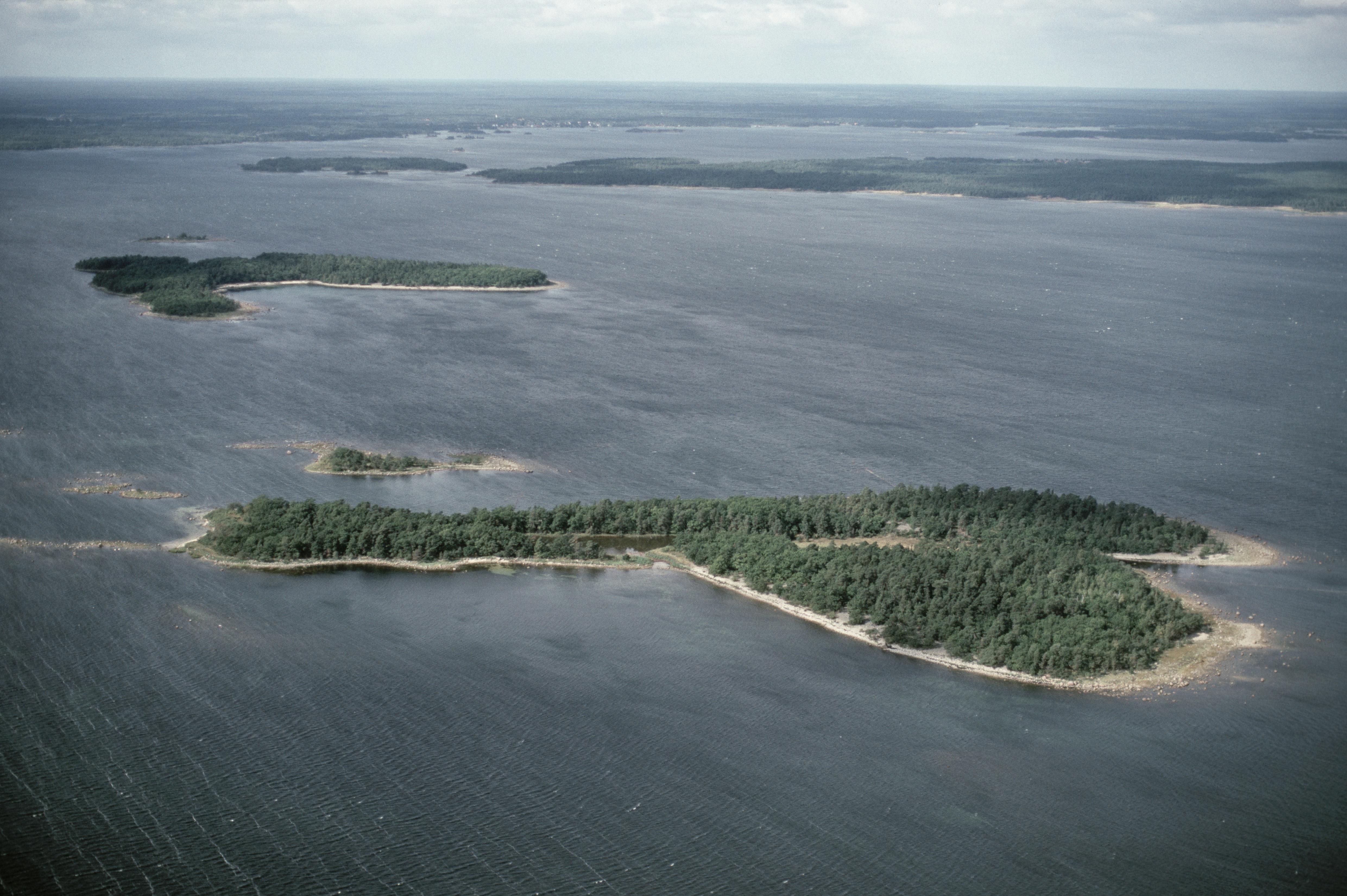 Beskrivning: Taktö i Vållö naturreservat. På ön finns flera fornlämningar, bl.a. fiskeläge RAÄnr Mönsterås 340:1. Sandö uppe till vänster. Bilden är tagen mot (väderstreck): V