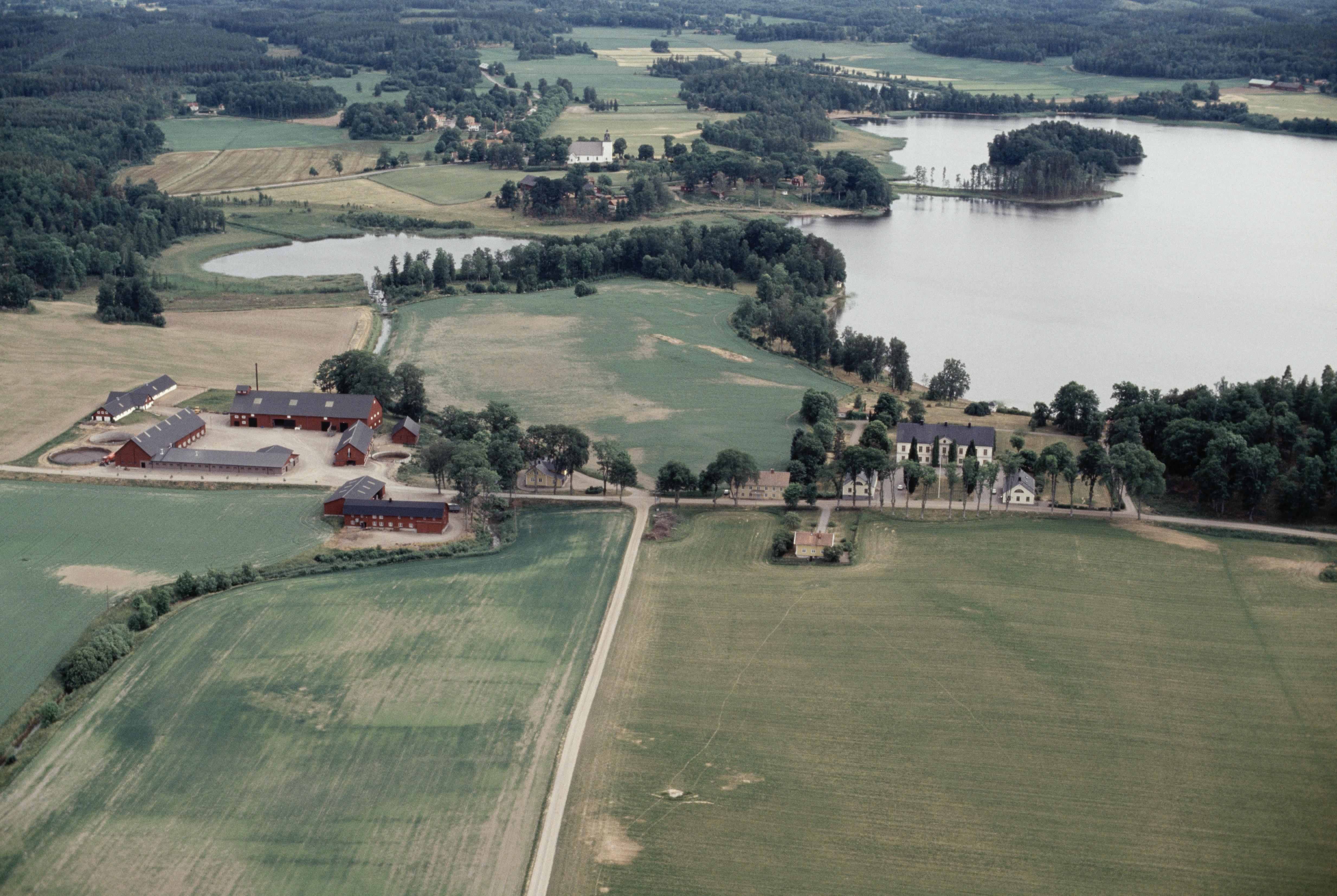 Beskrivning: Odensviholms herrgård vid Kyrksjön. I bildens övre del Odensvi kyrka och kyrkby. Bilden är tagen mot (väderstreck): SSO