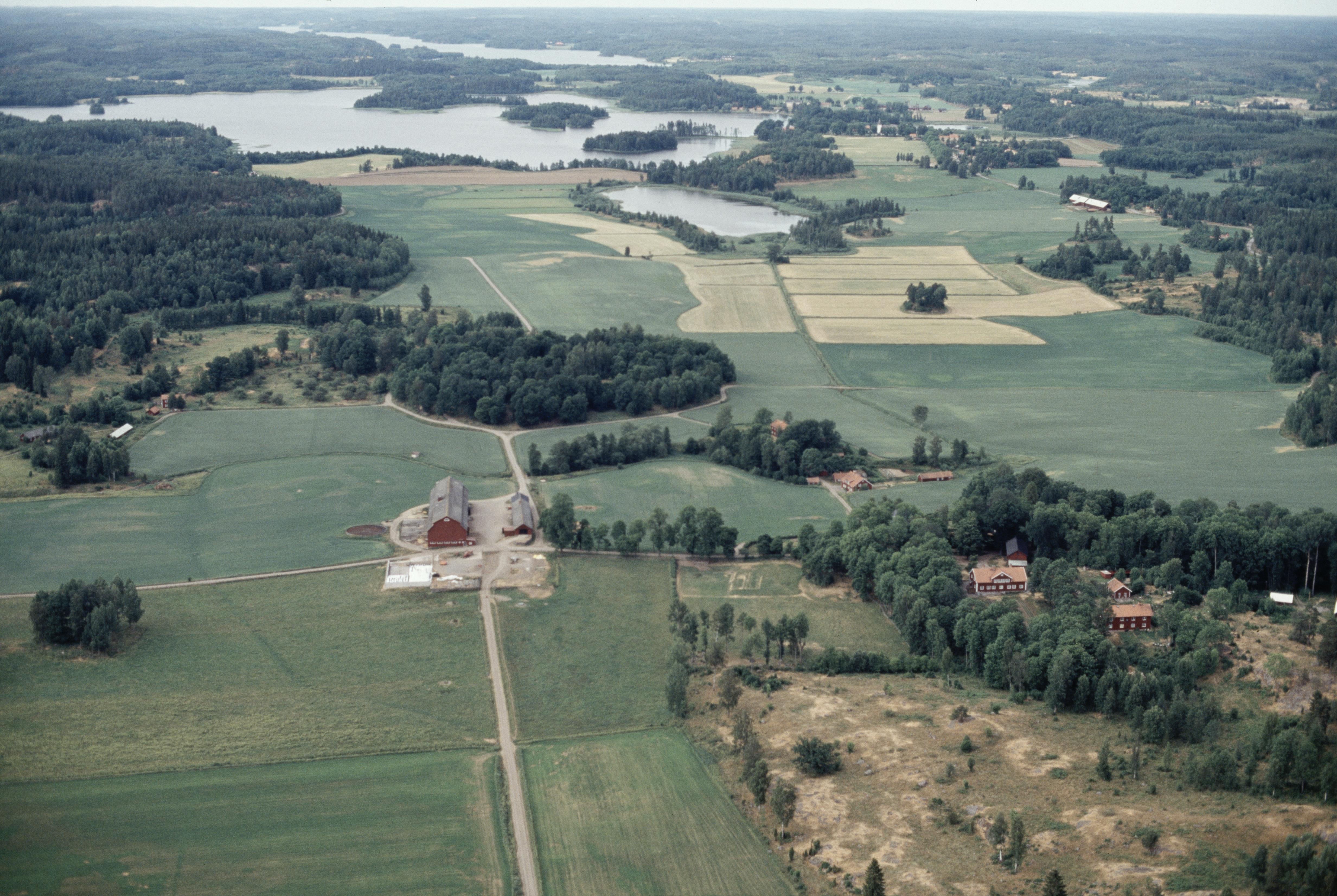 Beskrivning: Ogestads herrgård. I bildens övre del Odensvi kyrkby vid Kyrksjön. Bilden är tagen mot (väderstreck): N