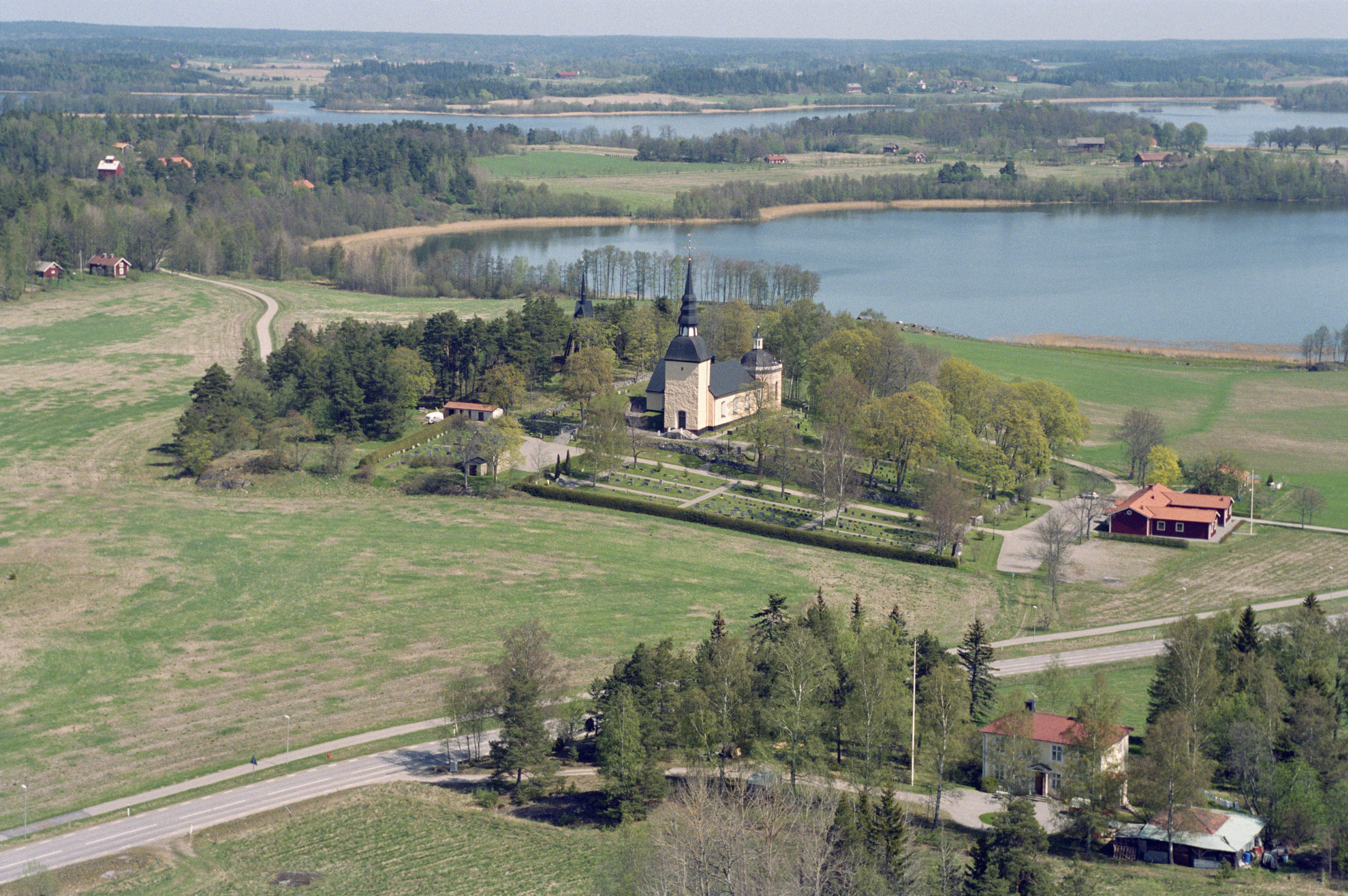 Beskrivning: Björnlunda kyrka vid Kyrksjön. Vid kyrkan bytomt RAÄnr Björnlunda 285:1 m.fl. Bilden är tagen mot (väderstreck): NO