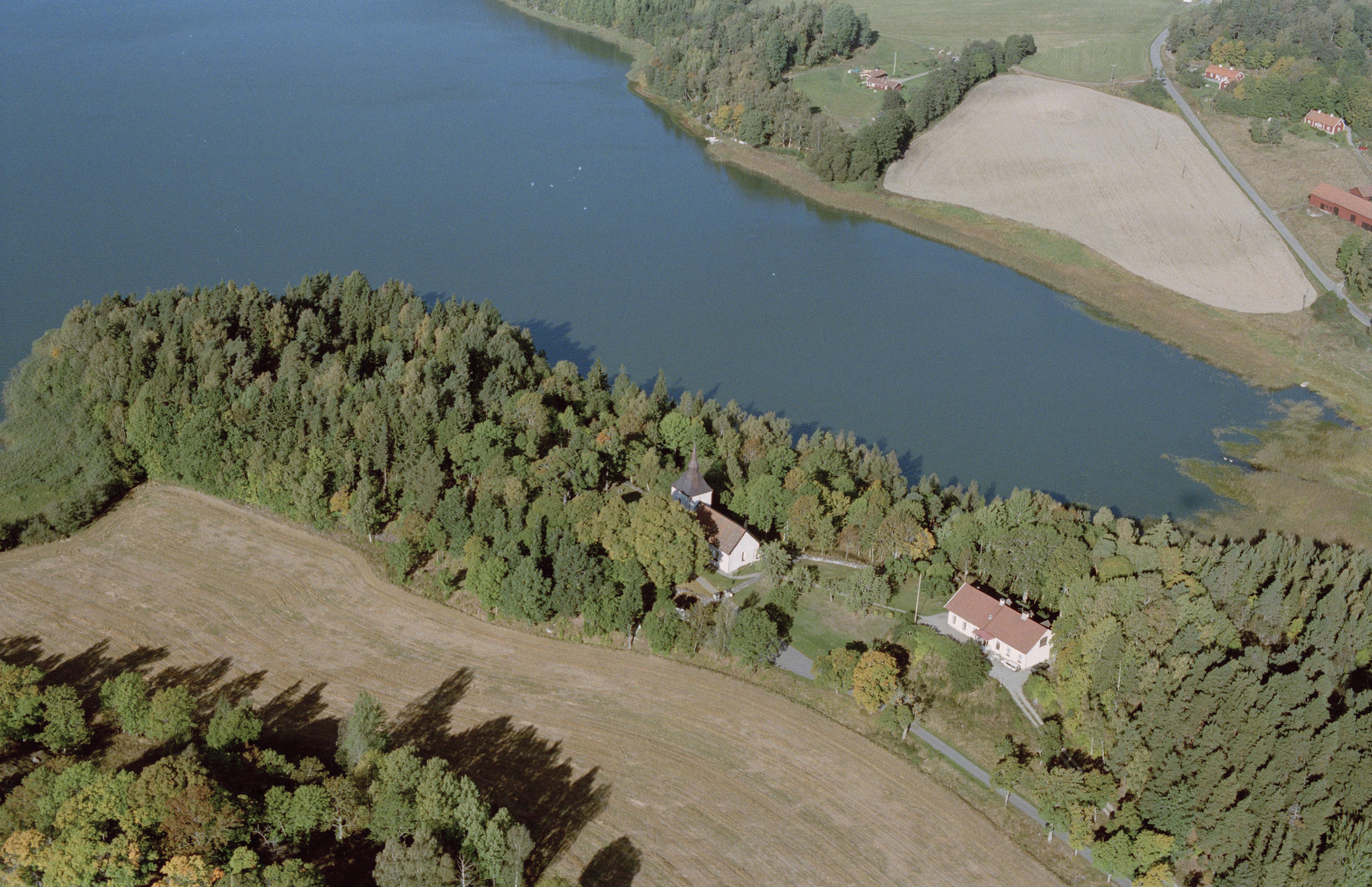 Beskrivning: Bogsta kyrka vid sjön Runnviken. Bilden är tagen mot (väderstreck): NV