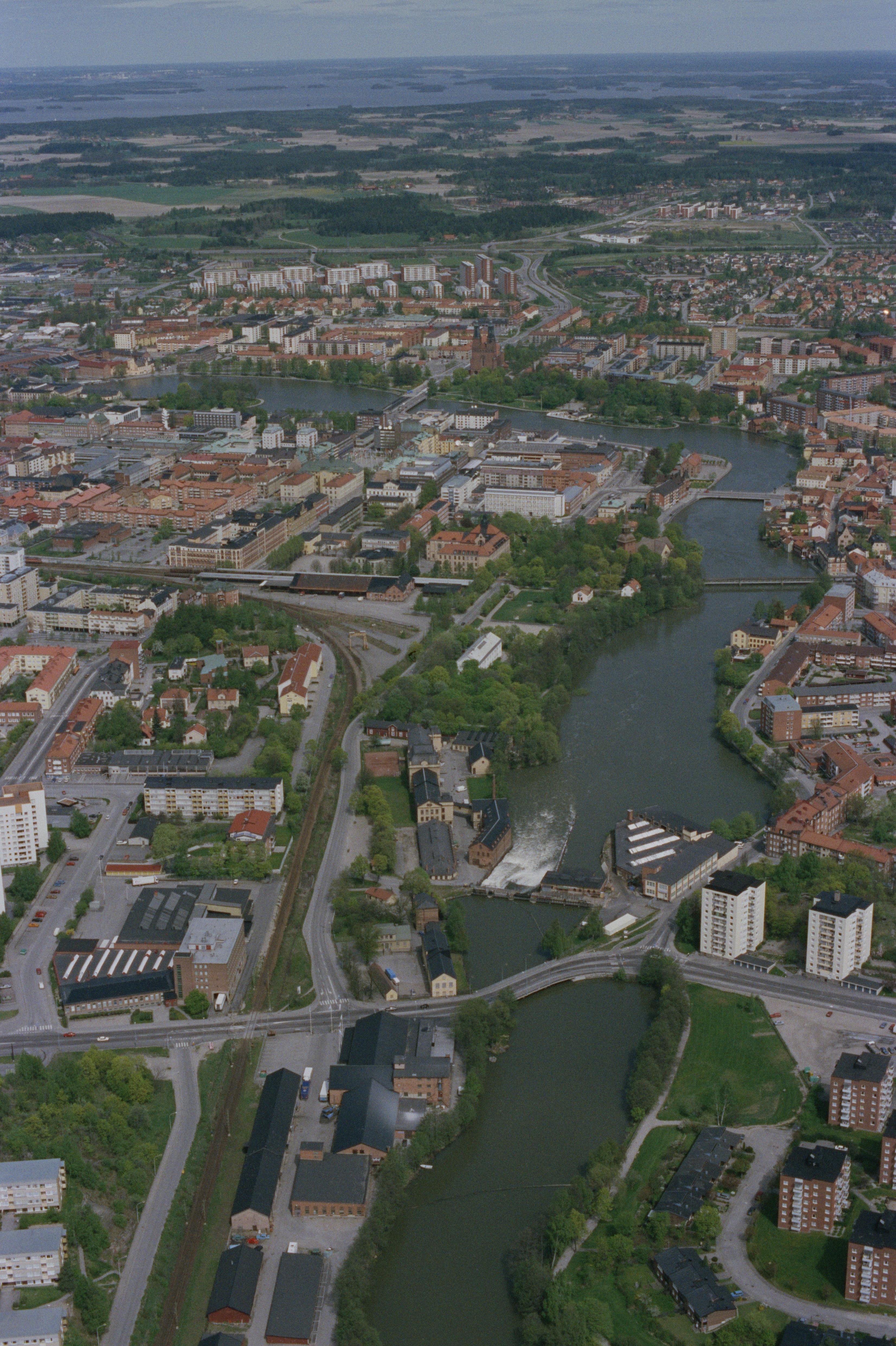 Beskrivning: Eskilstuna stad. Eskilstunaån. Klosters kyrka över bildens mitt. Bilden är tagen mot (väderstreck): NNO