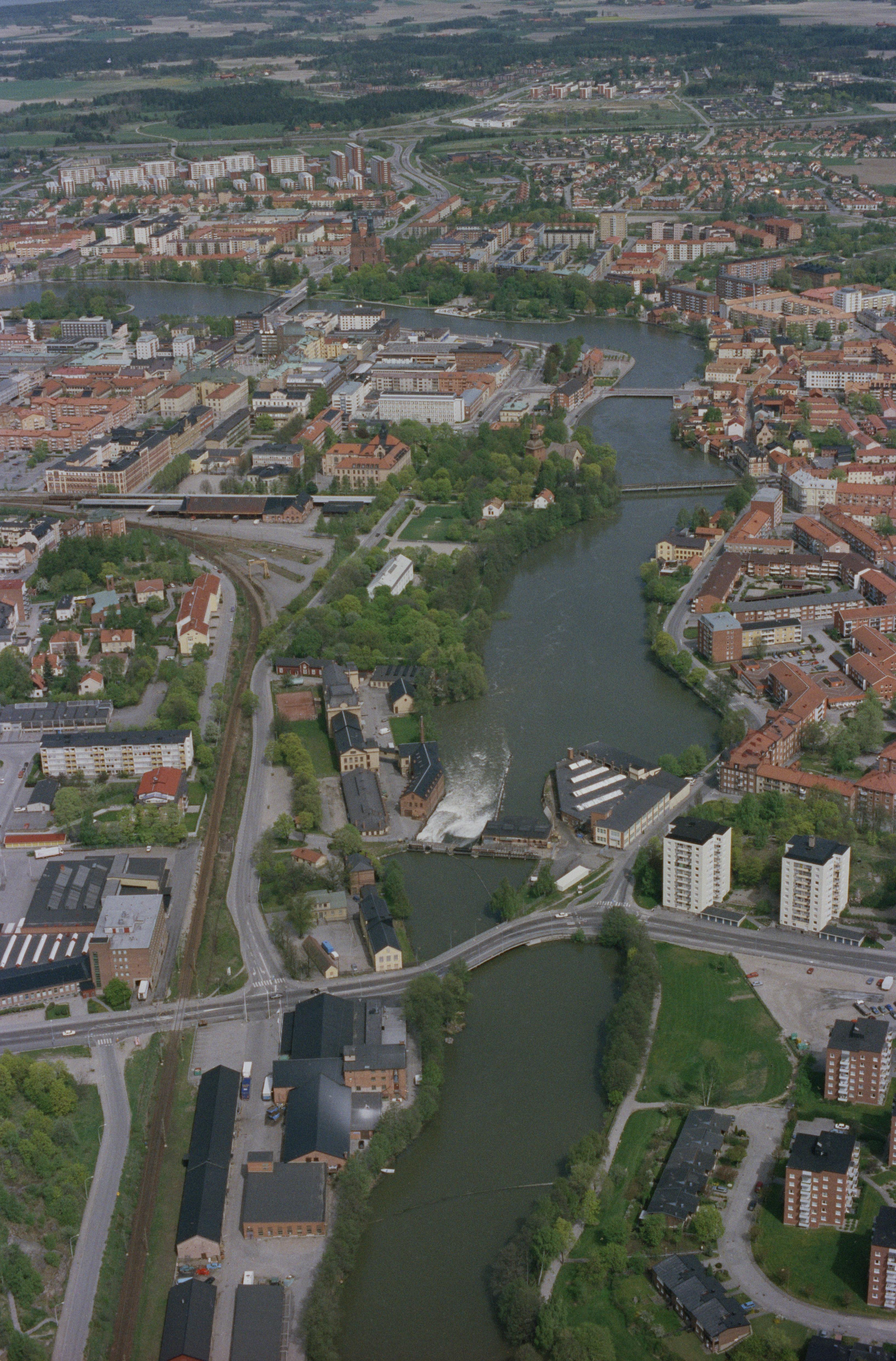 Beskrivning: Eskilstuna stad. Eskilstunaån. Klosters kyrka över bildens mitt. Bilden är tagen mot (väderstreck): NNO