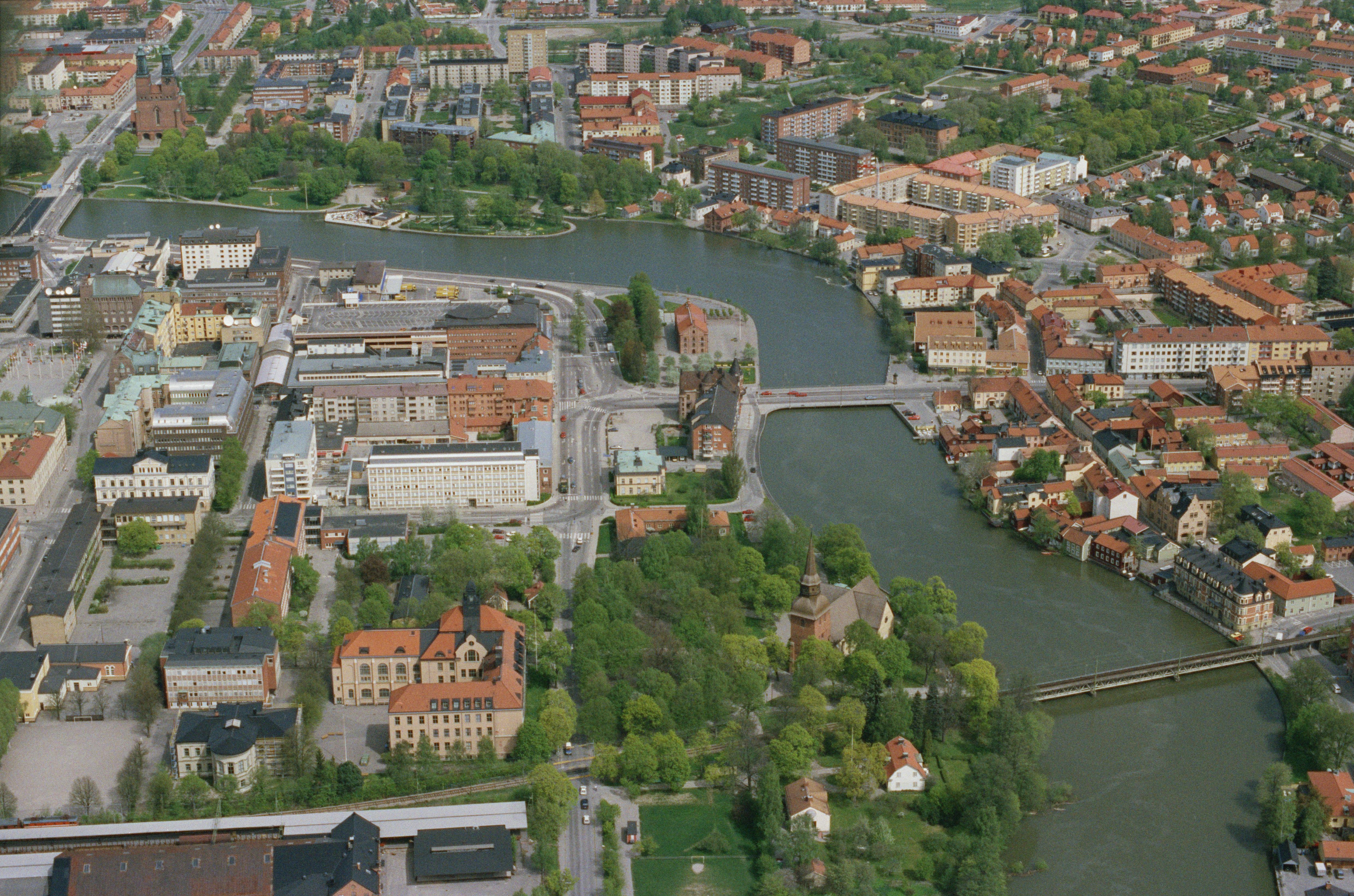 Beskrivning: Eskilstuna stad. Eskilstunaån. Klosters kyrka vid bildens mitt. Bilden är tagen mot (väderstreck): NNO