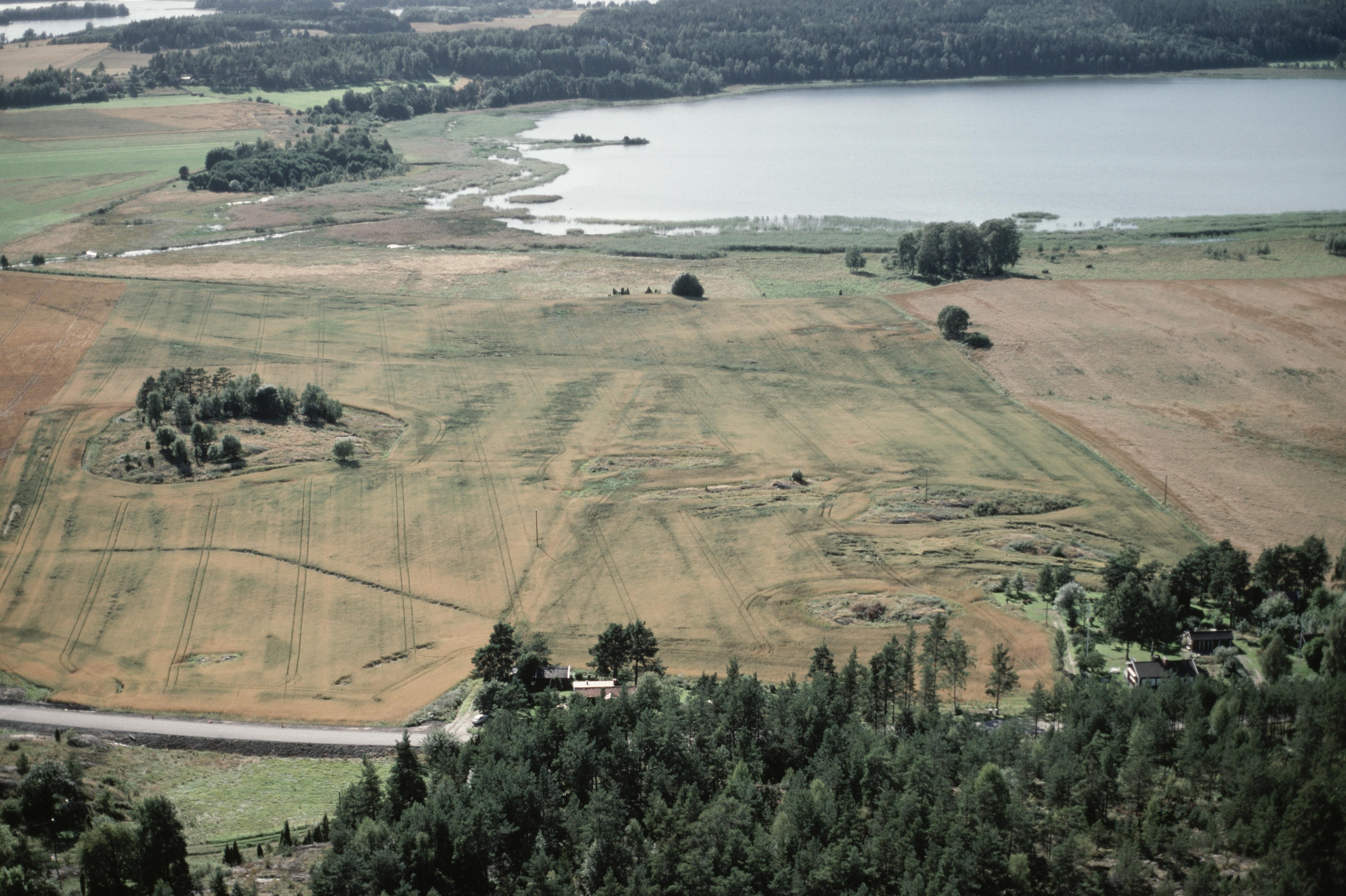 Beskrivning: Hällristningshällar i åker RAÄnr Gåsinge-Dillnäs 187:1-9, 189:1-4 m.fl. I bildens övre del Lifsingeåns mynning i Nyckelsjön. Bilden är tagen mot (väderstreck): VSV