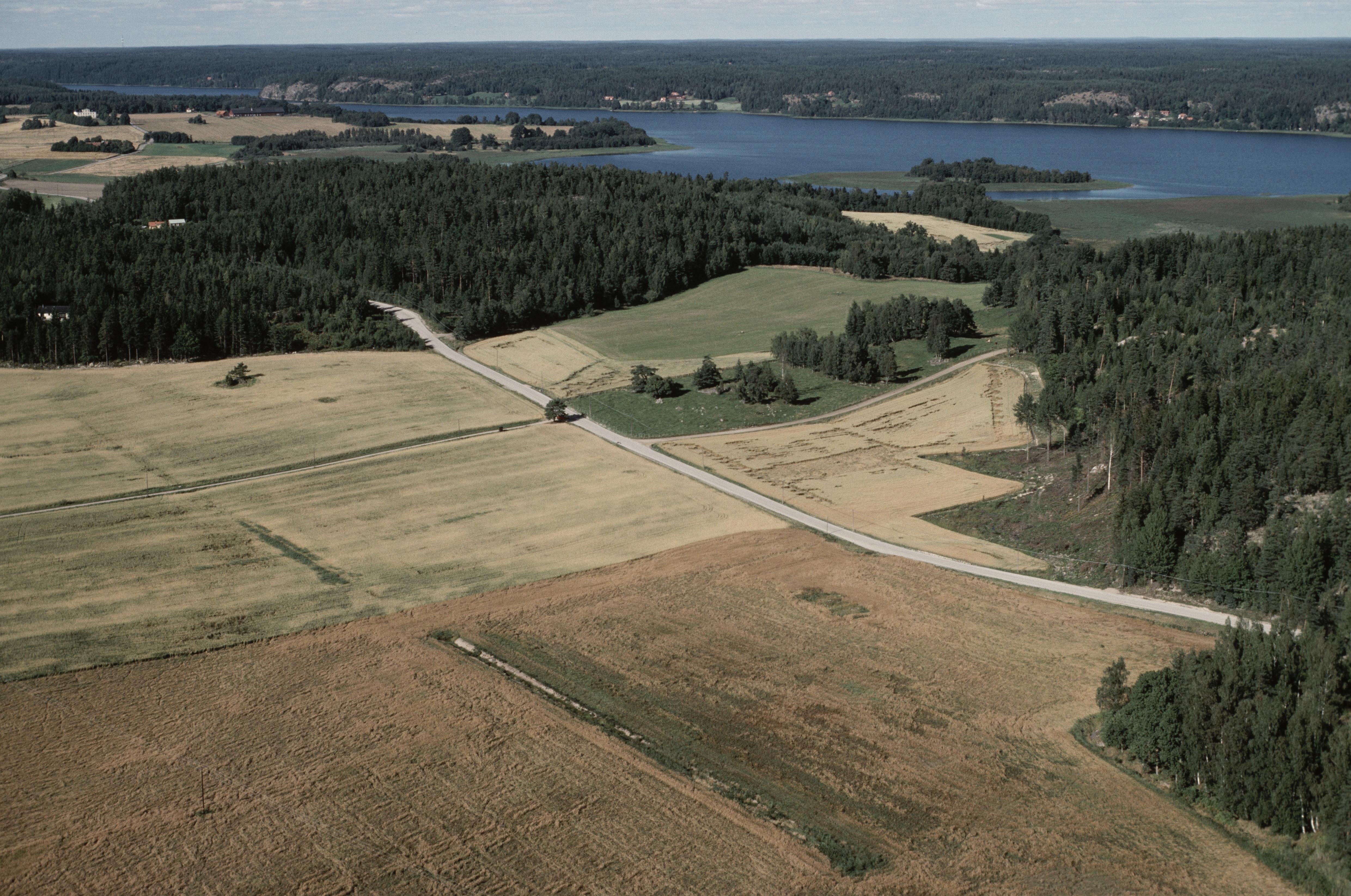 Beskrivning: Gravfält med hällristningshällar RAÄnr Gåsinge-Dillnäs 68:1-4, 533:1, 90:1-2, 91:1 m.fl. norrost om Nibble gård. I bildens övre del sjön Klämmingen. Bilden är tagen mot (väderstreck): N