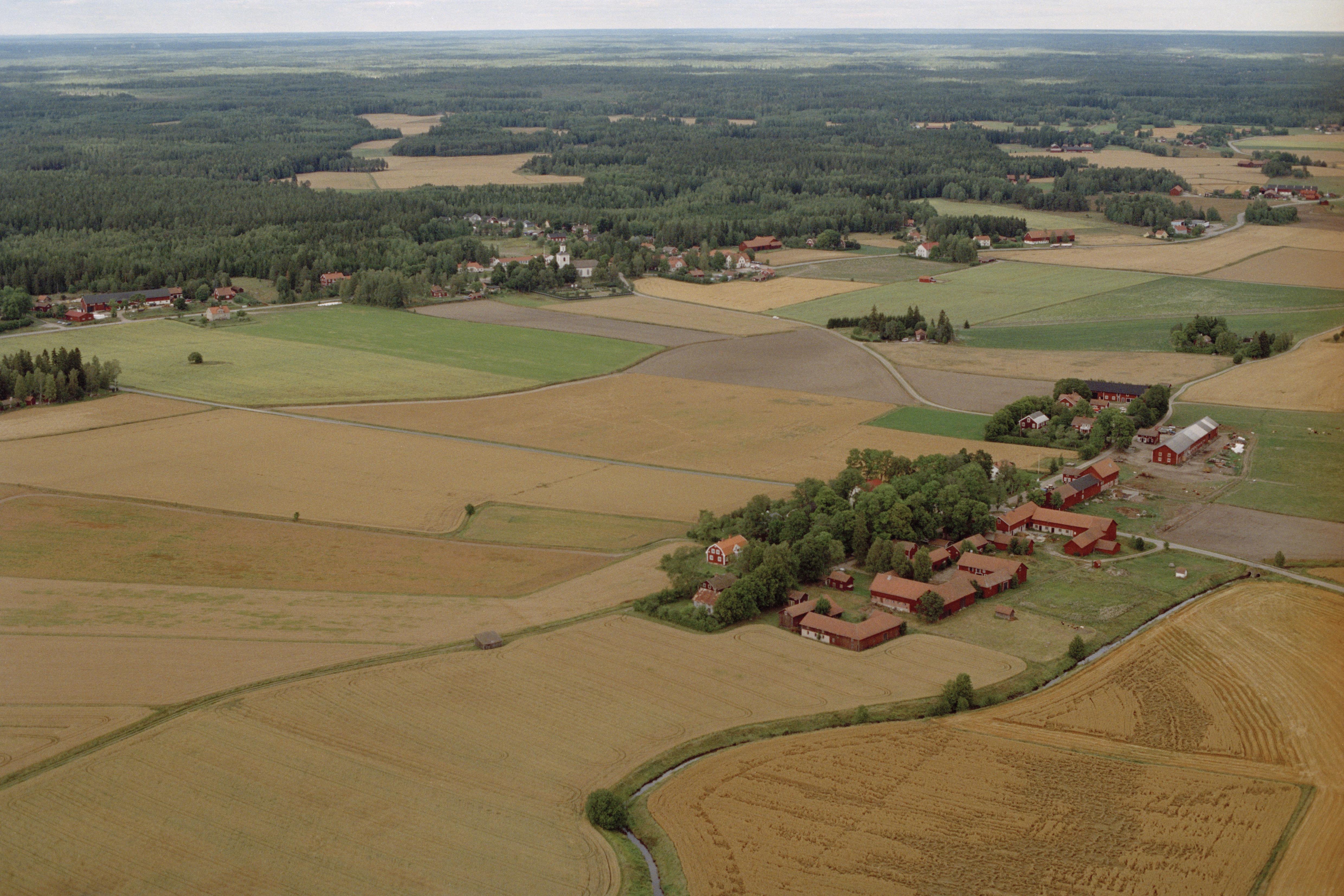 Beskrivning: Vretaåns dalgång. Vid bildens mitt radbyn Huddungeby. I bildens övre del Huddunge kyrka och kyrkby. Bilden är tagen mot (väderstreck): N