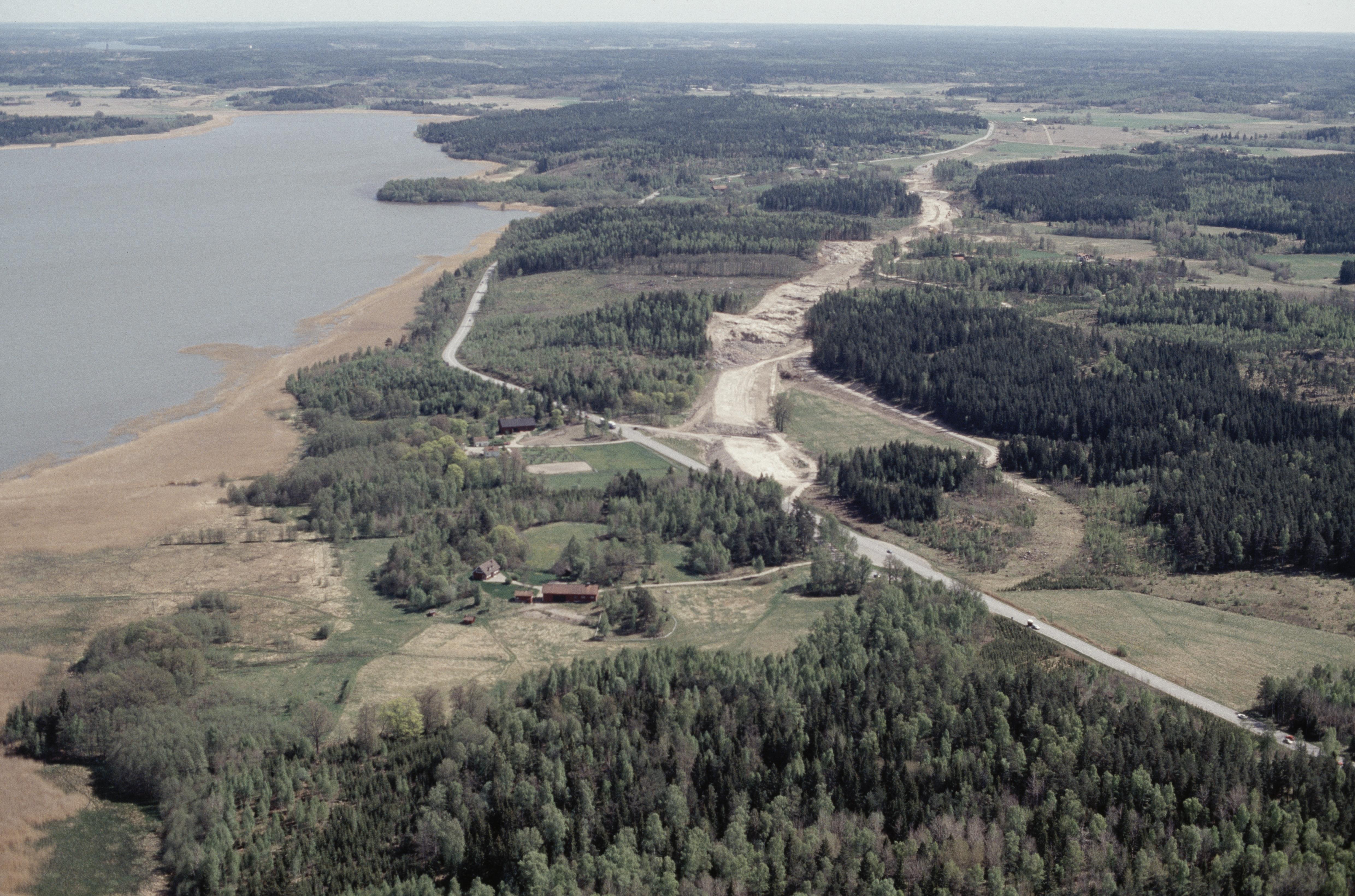 Beskrivning: Nere till vänster Fagerviks gård och färdväg RAÄnr Barva 126:1-2. Vid bildens mitt gränsen mot socknet Härad. Över bildens mitt arkeologiska undersökningar innan vägbygge av E3 / E20 i området söder om Sörfjärden i Mälaren. Bilden är tagen mot (väderstreck): Ö
