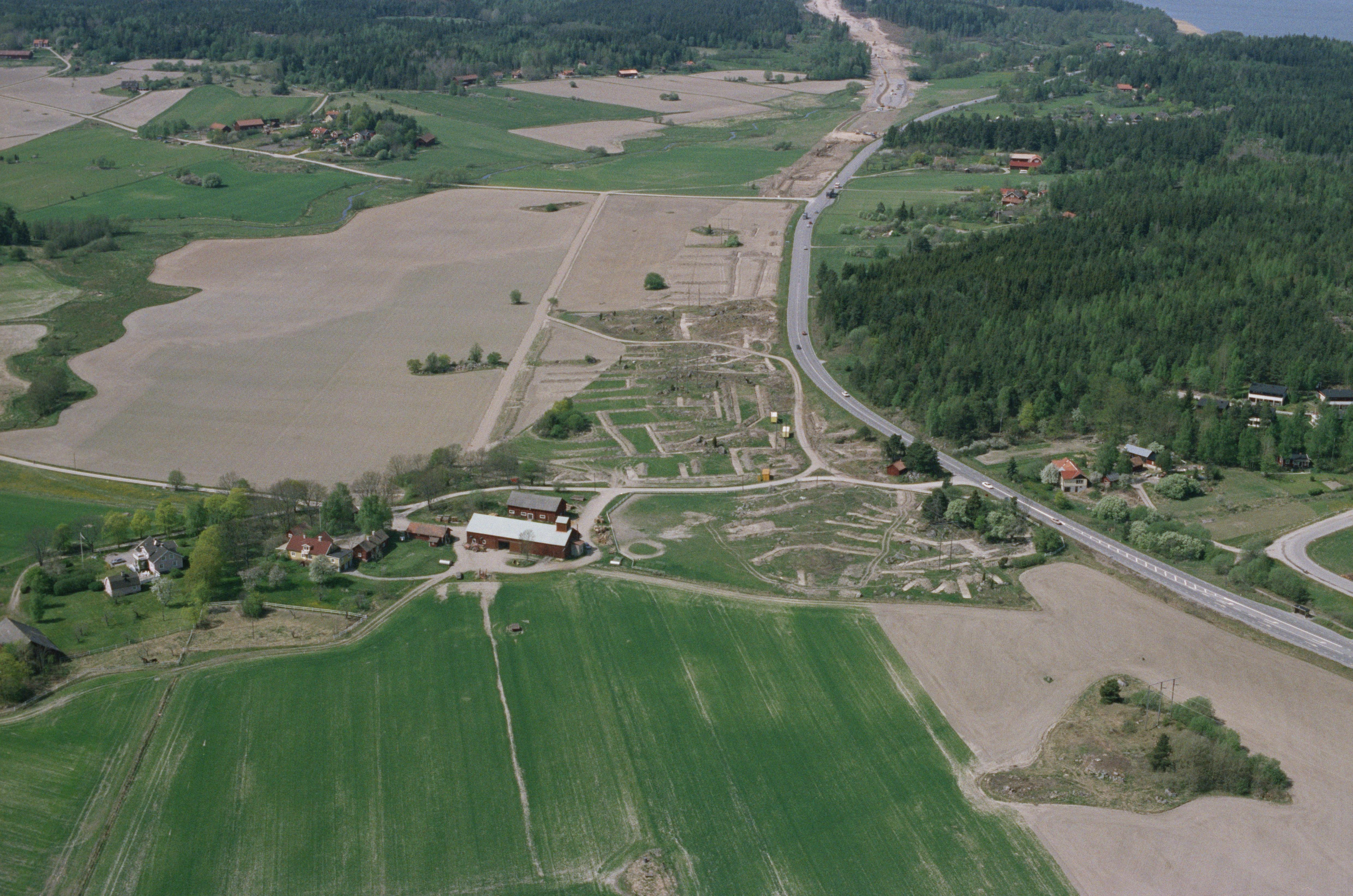 Beskrivning: Arkeologiska undersökningar innan vägbygge av E3 / E20 i området söder om Sörfjärden i Mälaren. Vid bildens mitt grav- och boplats RAÄnr Härad 72:1, 82:1 m.fl. vid Kumla by. I bildens övre del Eksåg. Bilden är tagen mot (väderstreck): VNV
