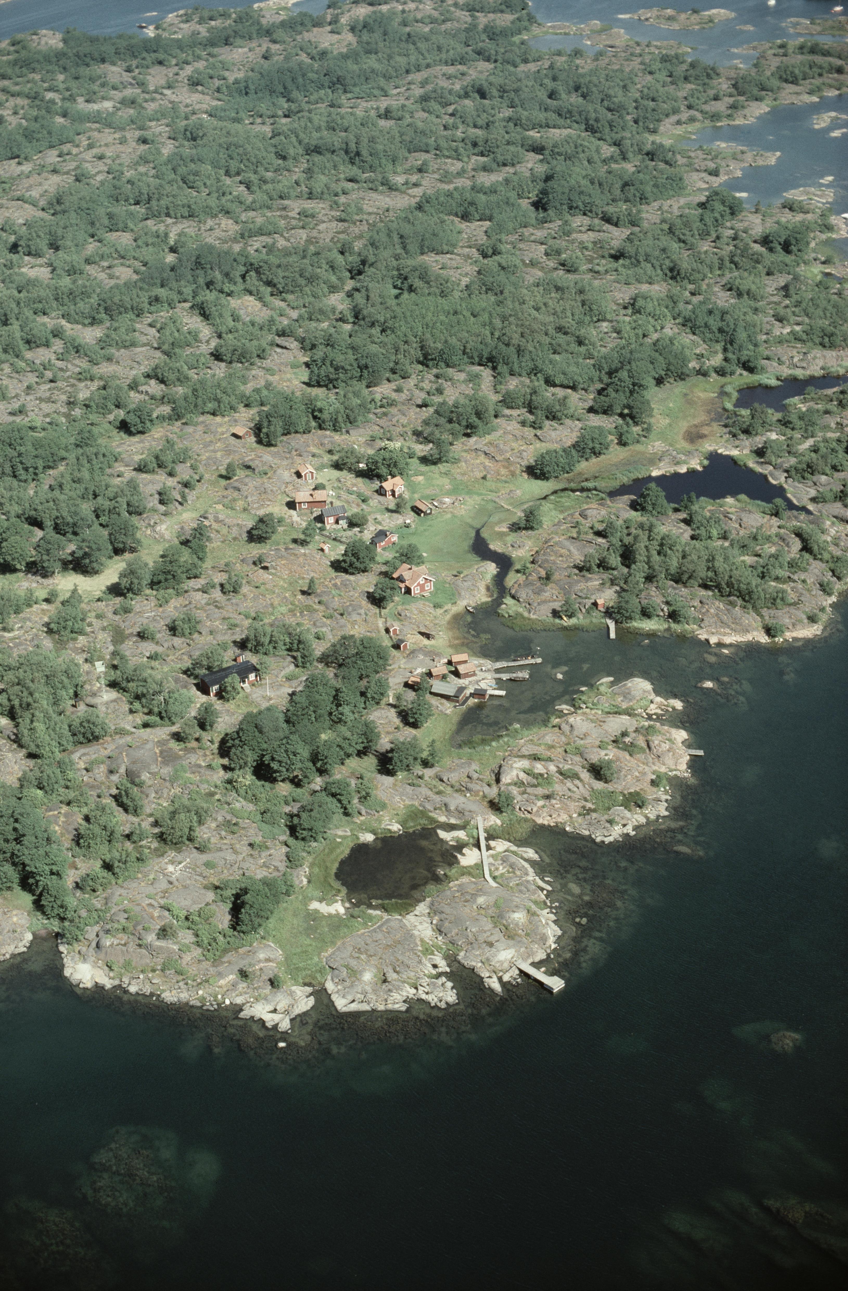 Beskrivning: Långviksskärs naturreservat i Nämndöfjärden. Ön Långviksskär med kringliggande öar och holmar. Vid bildens mitt Långviksskärs by vid Björkströmmen. I bildens övre del husgrund RAÄnr Nämdö 24:1. Bilden är tagen mot (väderstreck): NNO
