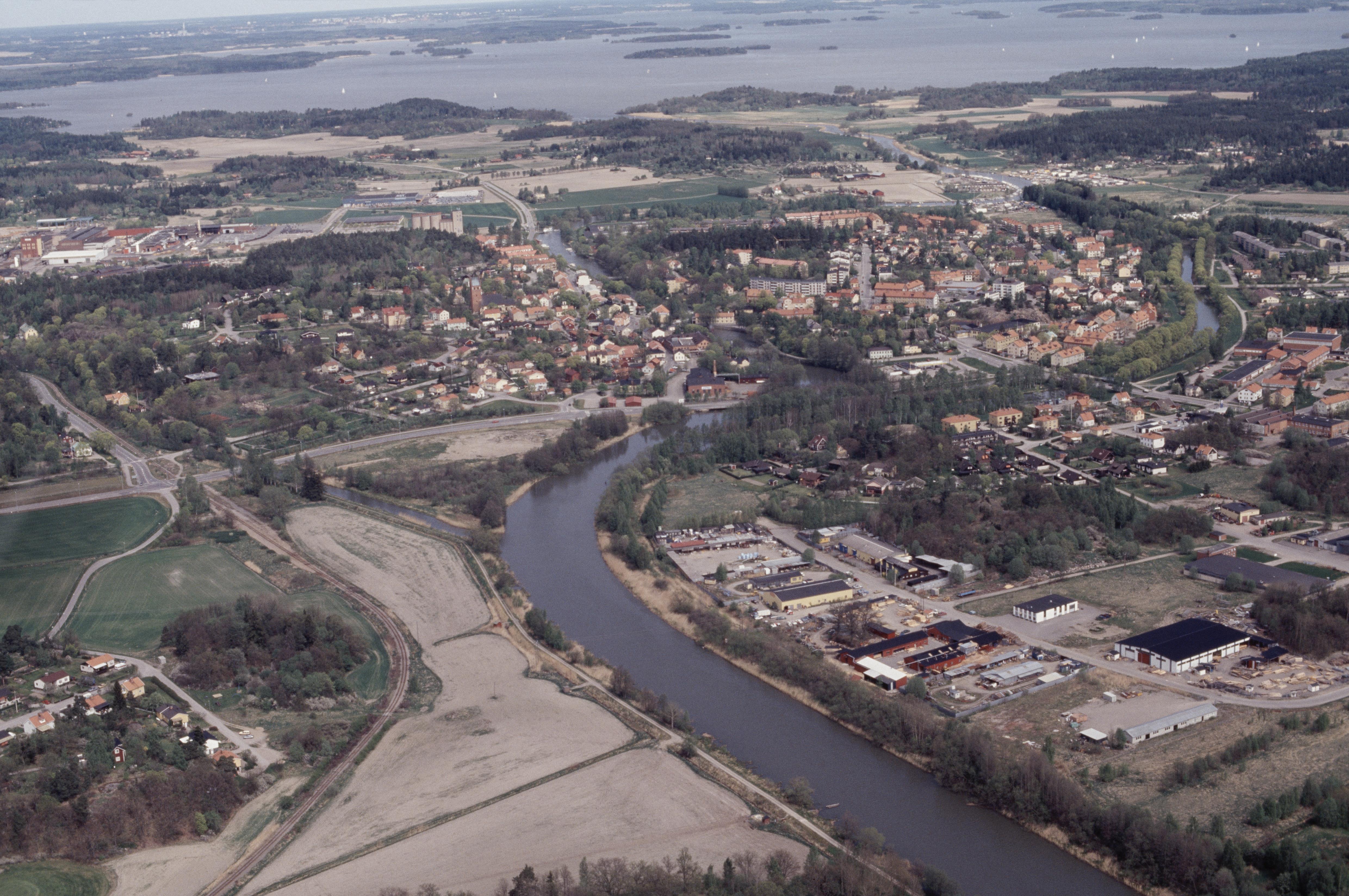 Beskrivning: Torshälla tätort. Nybyån och Eskilstunaån möts. Mälaren i bildens övre del. Bilden är tagen mot (väderstreck): NNO
