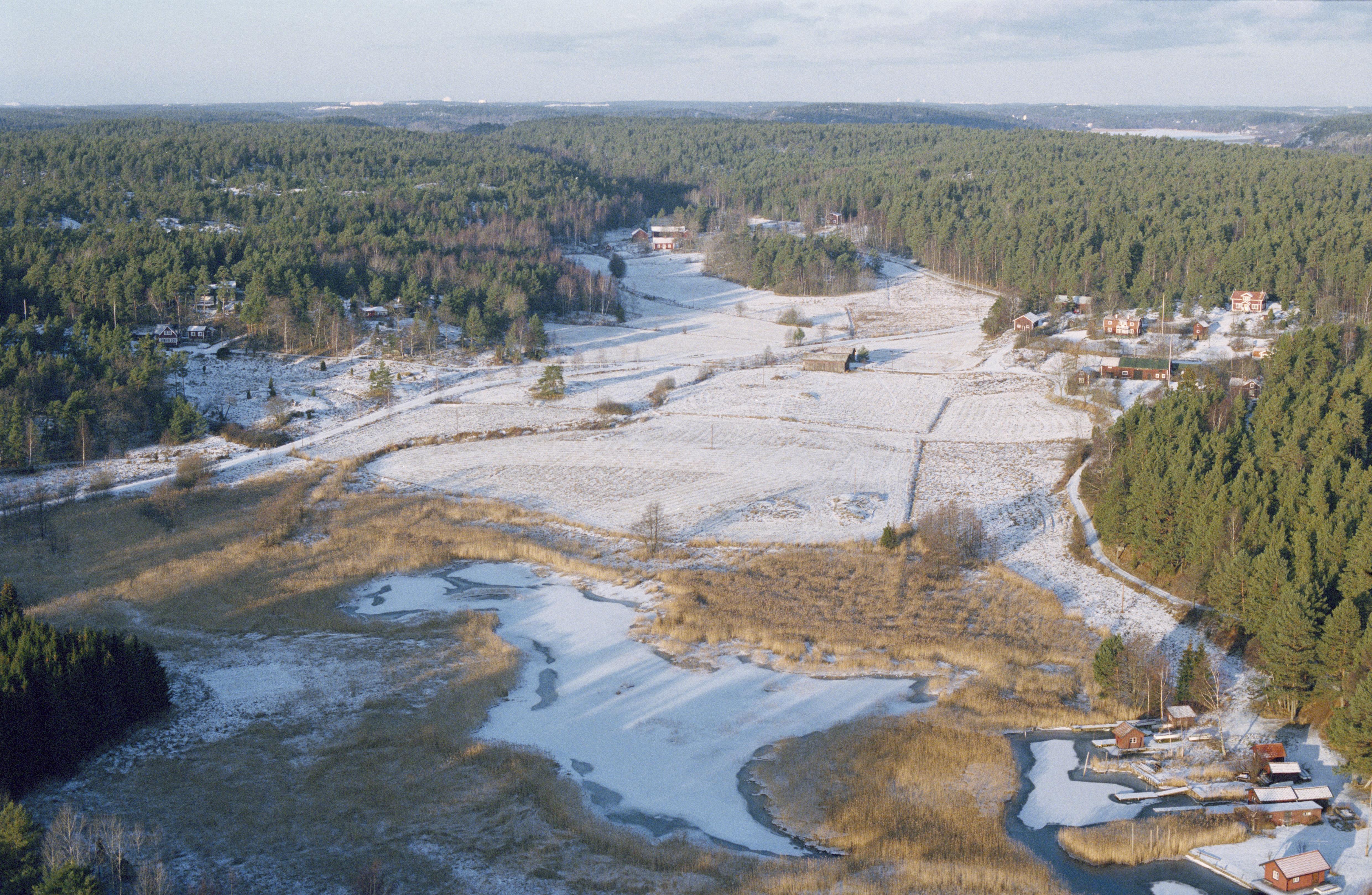 Beskrivning: Tyresta naturrreservat. Vissvass by vid Vissvassfjärden. I bildens övre del Norrgården och Vissvassdalen mot Mörkdalen. Bilden är tagen mot (väderstreck): NV