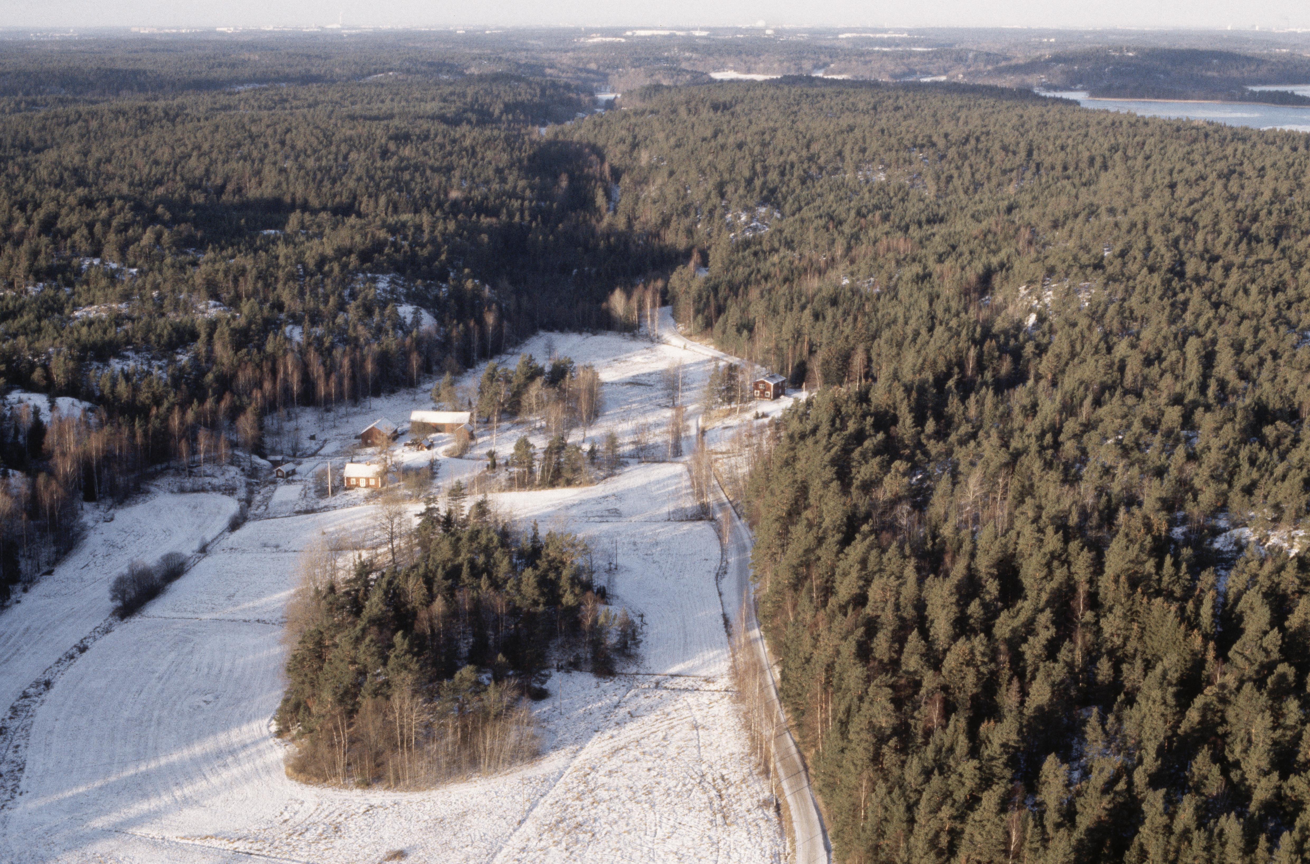 Beskrivning: Tyresta naturrreservat. Norrgården norrväst i Vissvass by vid bildens mitt. I bildens övre del Vissvassdalen mot Mörkdalen. Bilden är tagen mot (väderstreck): VNV
