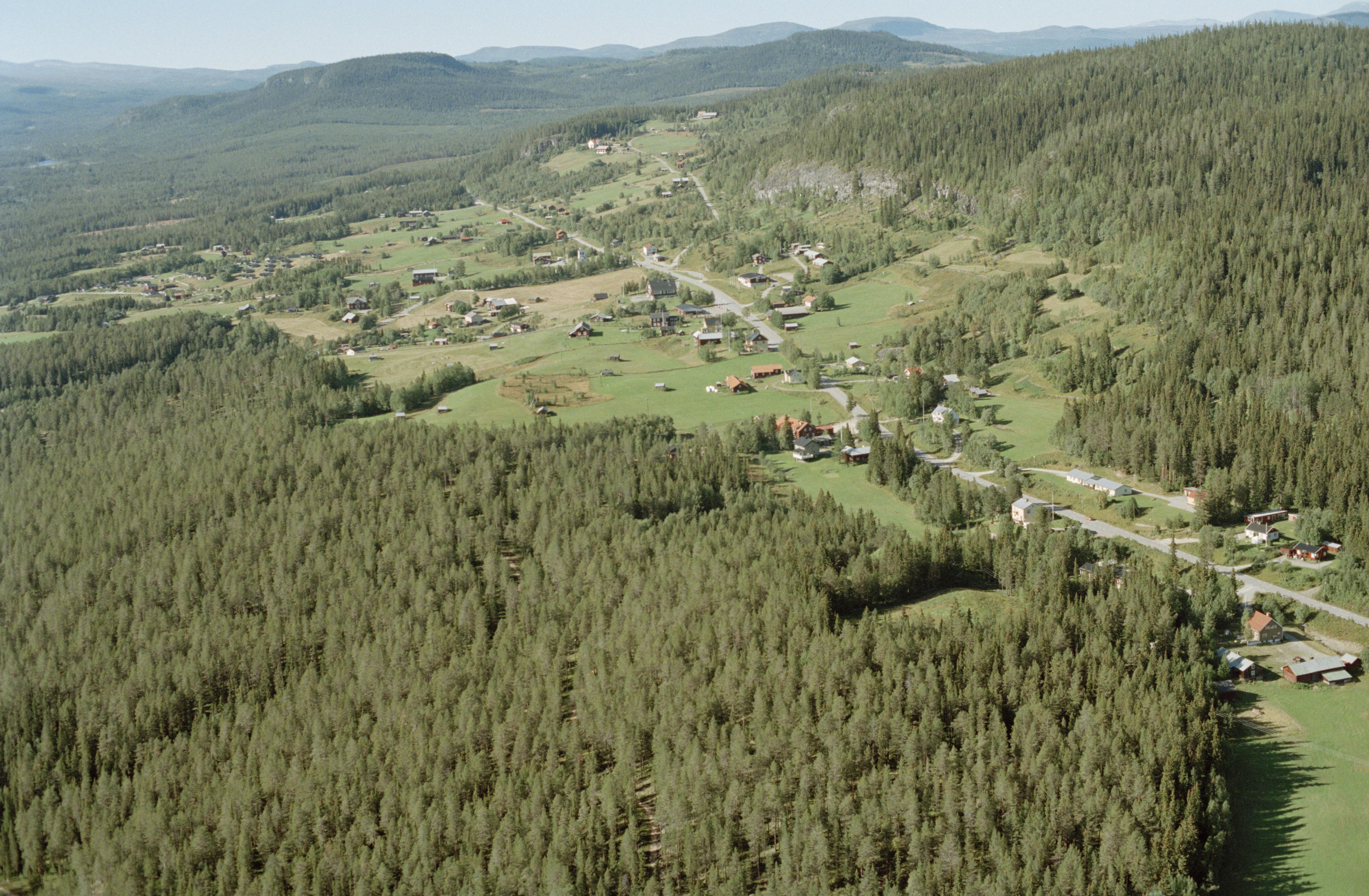 Beskrivning: Tännäs (Neassa) kyrkby. Tännäs kyrka över bildens mitt. I skogen uppe till höger på Vegarsberget en fångstgrop RAÄnr Tännäs 215:1. Bilden är tagen mot (väderstreck): NNV