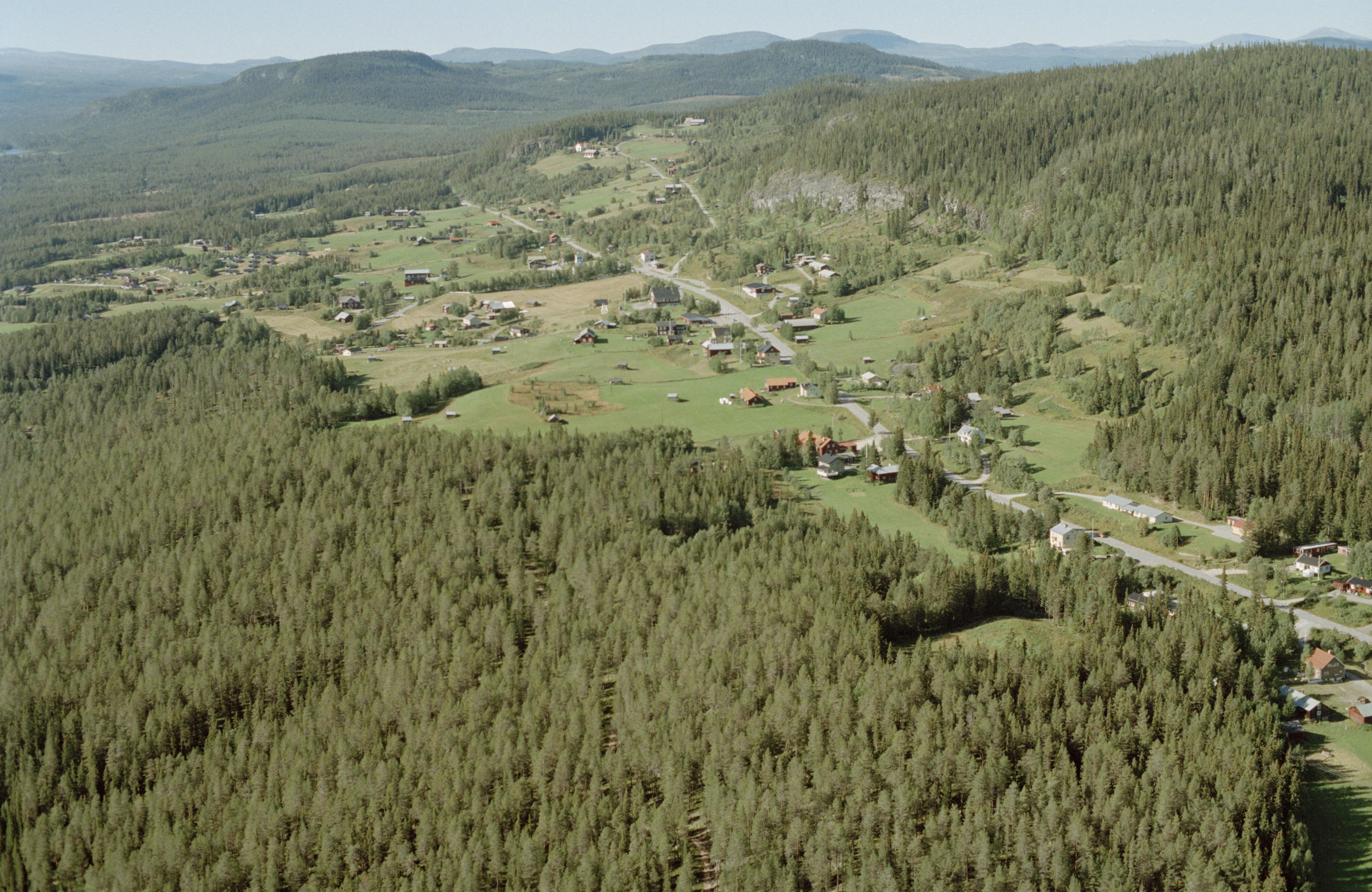 Beskrivning: Tännäs (Neassa) kyrkby. Tännäs kyrka över bildens mitt. I skogen uppe till höger på Vegarsberget en fångstgrop RAÄnr Tännäs 215:1. Bilden är tagen mot (väderstreck): NNV