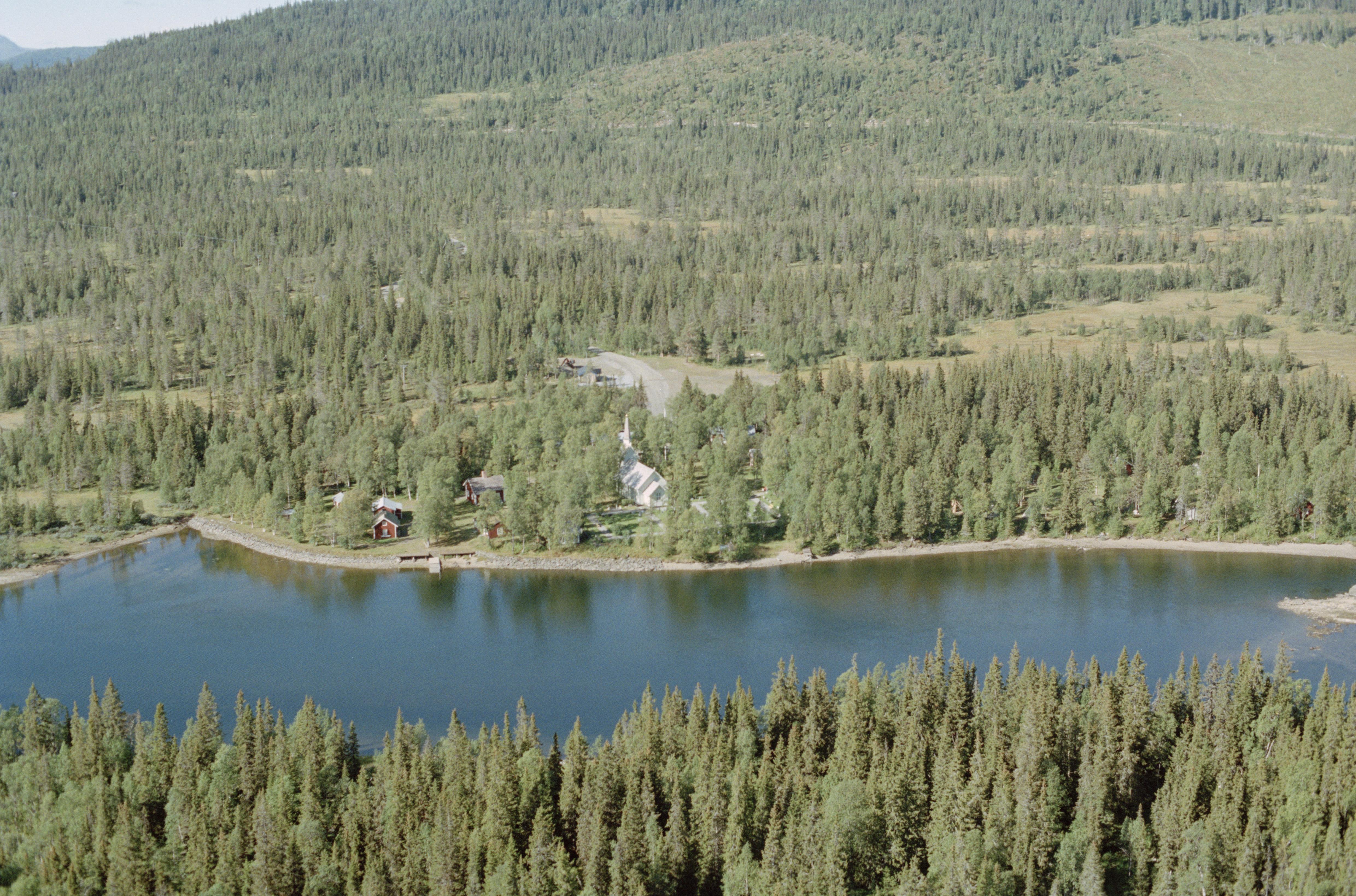 Beskrivning: Ankarede by / kyrkby vid Lejarälven och Stor-Blåsjön (Plaavere). Ankarede kapell vid bildens mitt. I skogen i bildens nedre kant fångstgrop RAÄnr Frostviken 203:1. Vid stranden i bildens högra kant en plats med tradition RAÄnr Frostviken 228:1. Bilden är tagen mot (väderstreck): NV