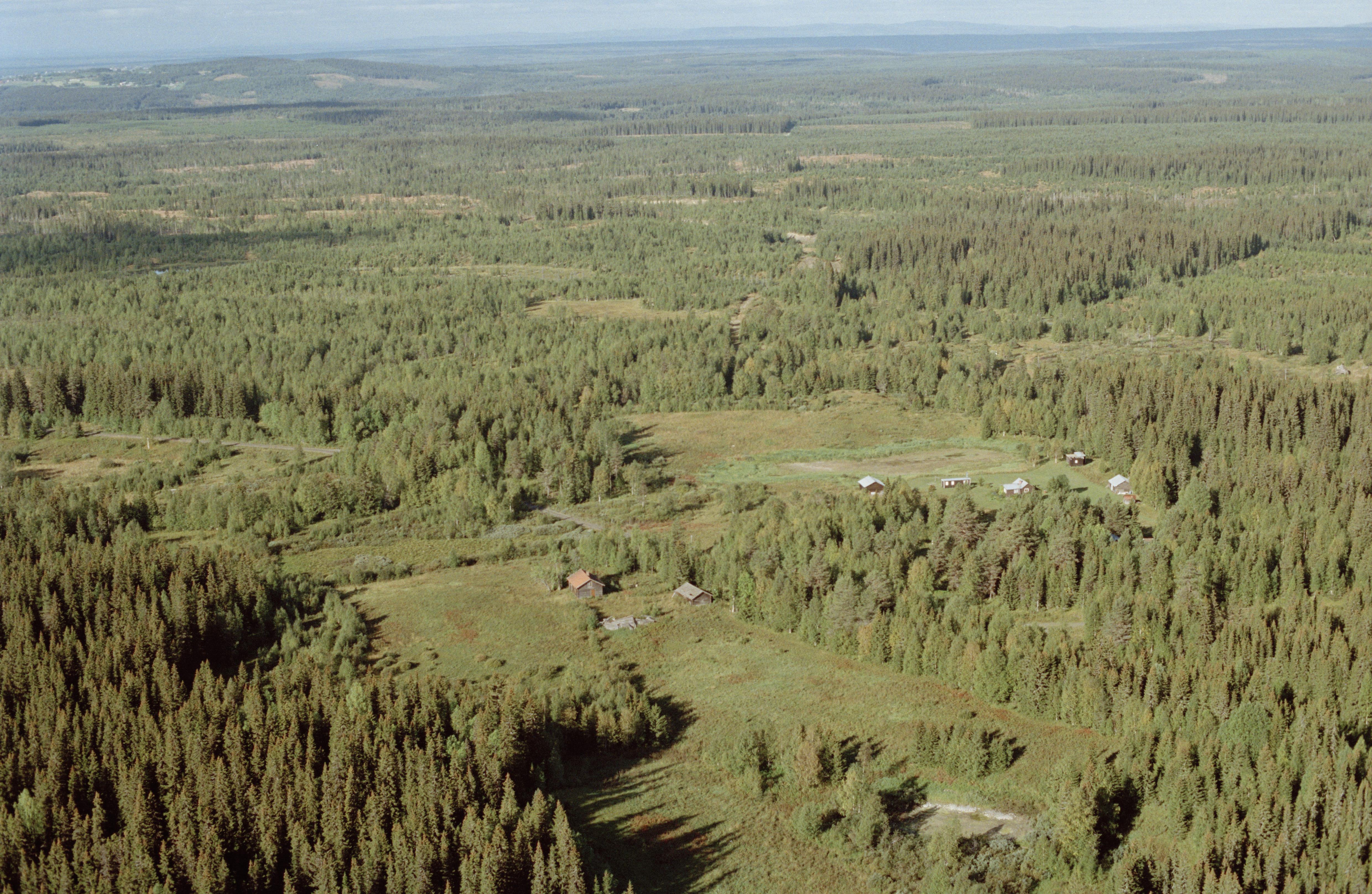 Beskrivning: Fäbodområdet Trångbodarna. I bildens övre del område med fångstgropssystem RAÄnr Häggenås 19:1 vid Antebodarna. Bilden är tagen mot (väderstreck): V