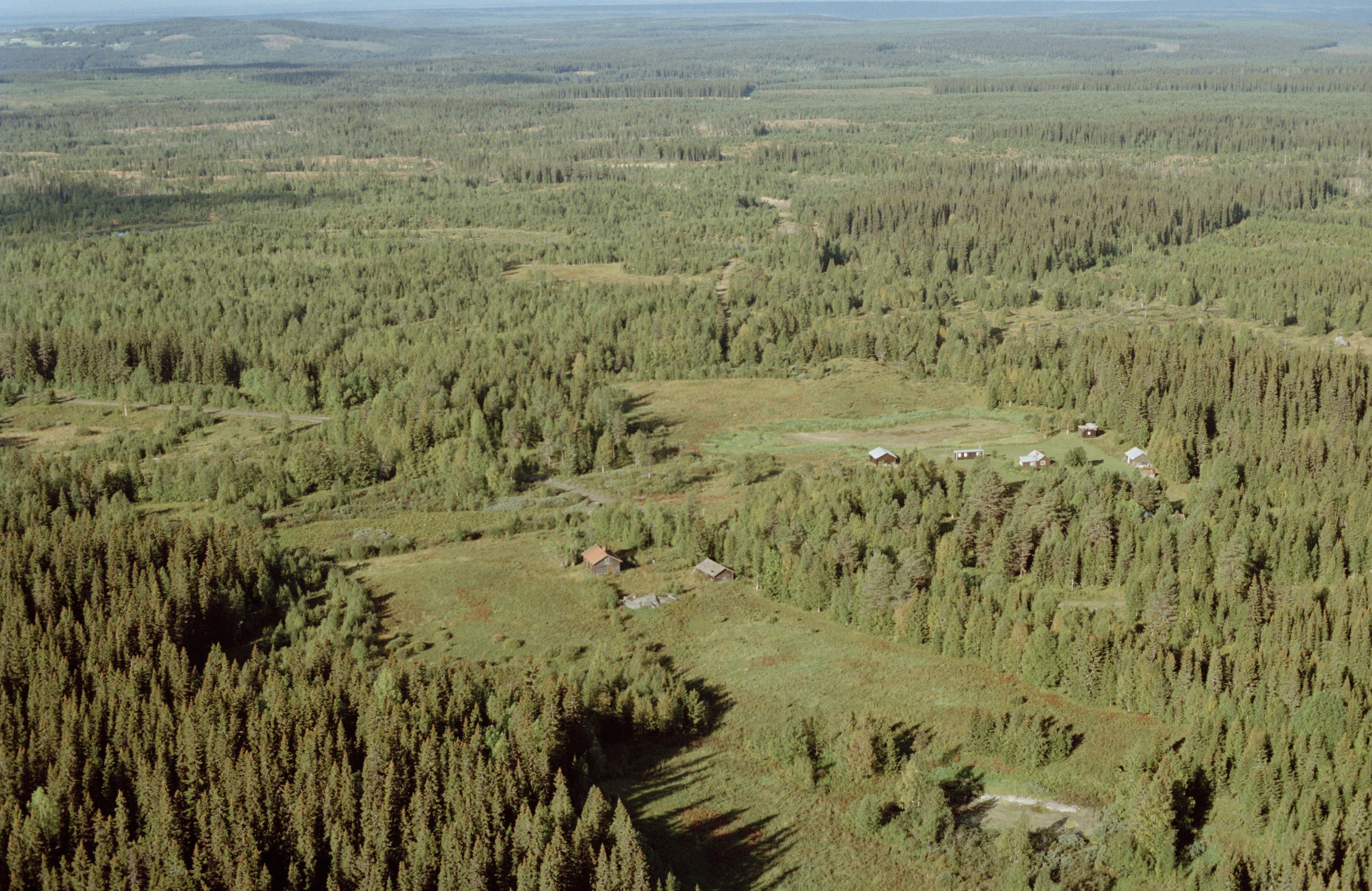 Beskrivning: Fäbodområdet Trångbodarna. I bildens övre del område med fångstgropssystem RAÄnr Häggenås 19:1 vid Antebodarna. Bilden är tagen mot (väderstreck): V
