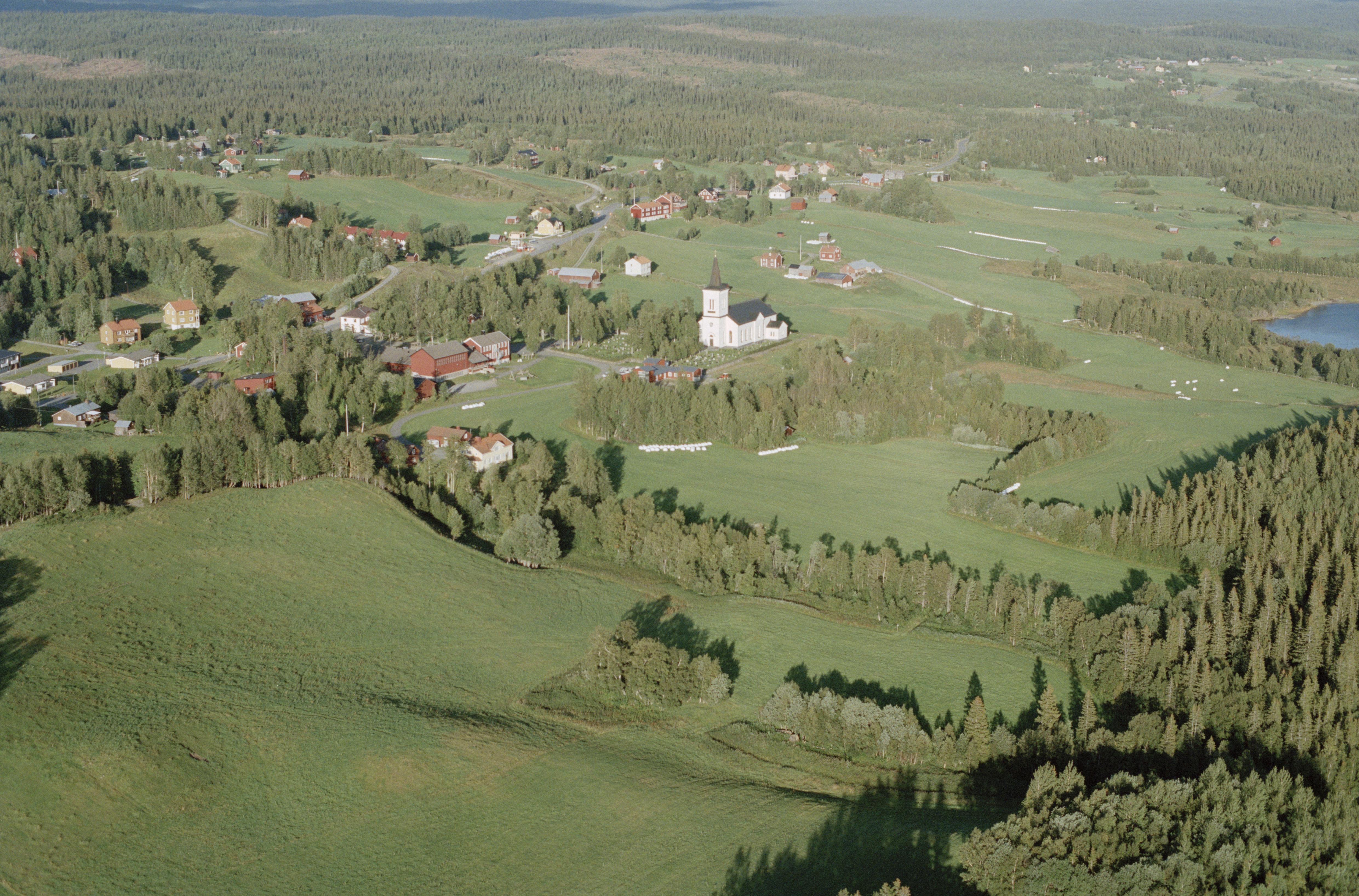 Beskrivning: Kalls kyrkby vid Kallsjön. Kalls kyrka med minnesmärke RAÄnr Kall 29:1vid bildens mitt. Bilden är tagen mot (väderstreck): NO
