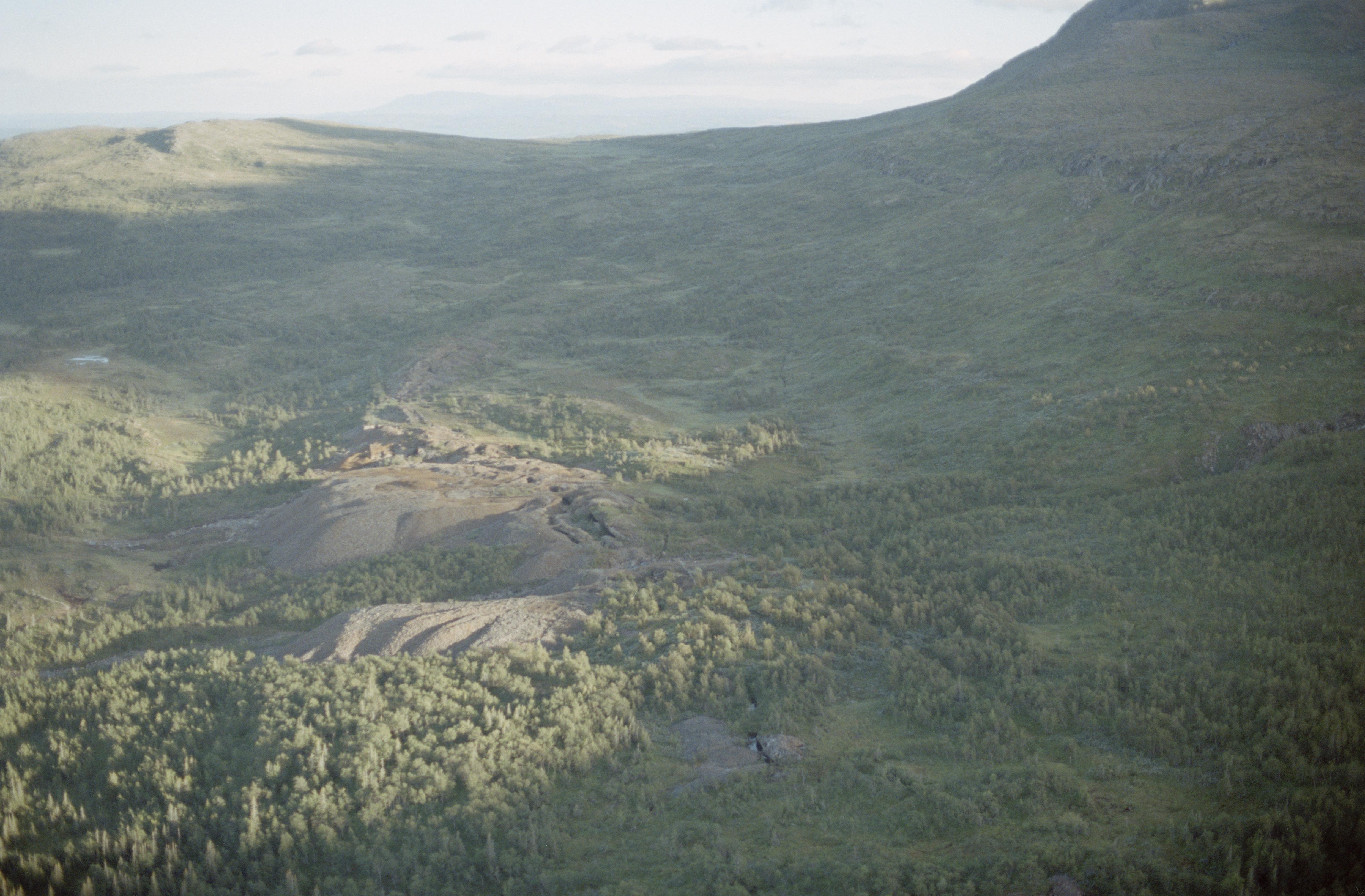 Beskrivning: Fjällområdet Åreskutan, norra delen. I fjällsidan vid bildens mitt gruvområdet Bjelkes gruvor (skrivs även Bielkes gruvor) RAÄnr Kall 39:1. Över bildens mitt (längs fjällkanten) går gränsen mot socknet Åre. Bilden är tagen mot (väderstreck): SO