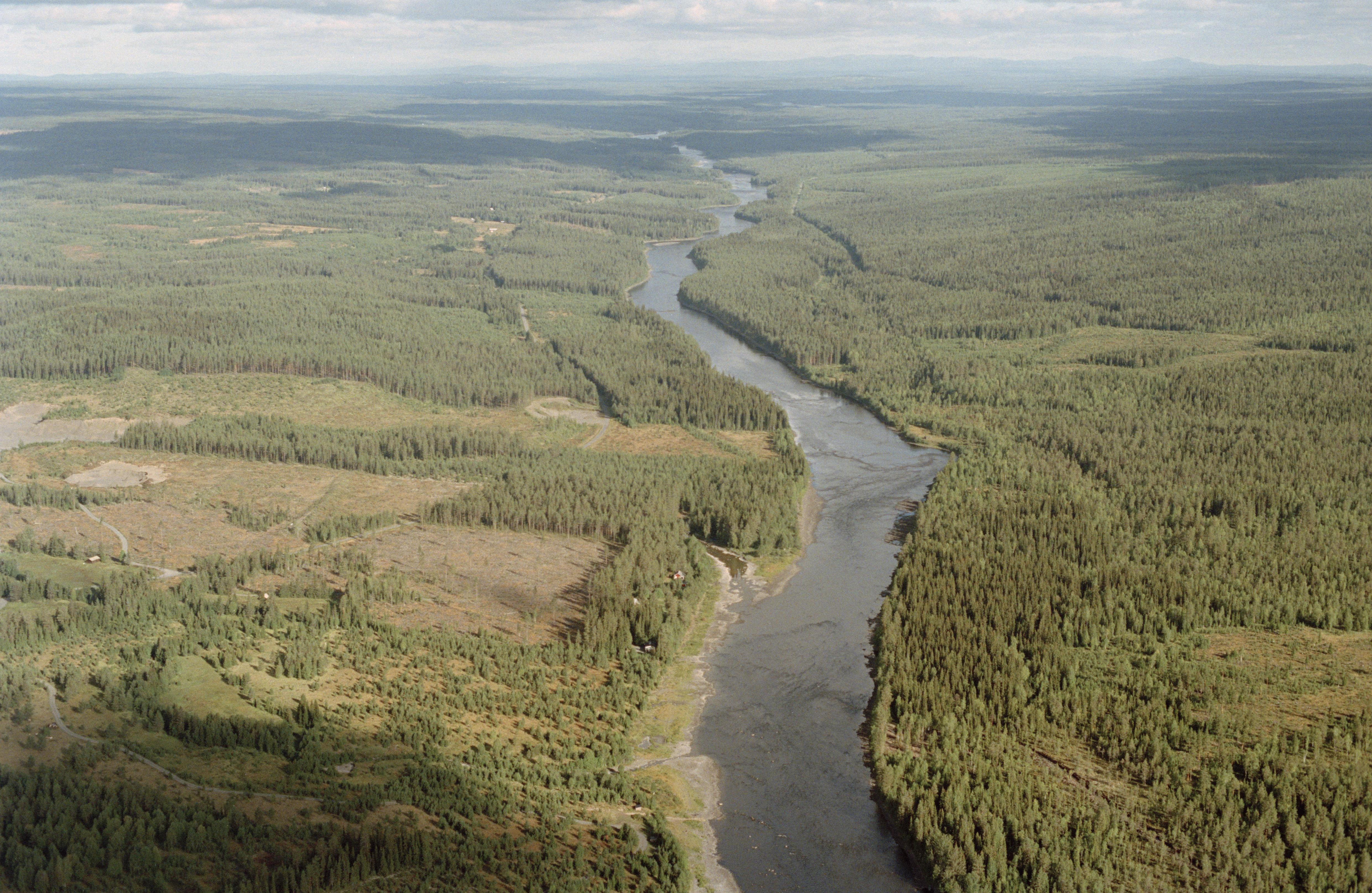 Beskrivning: Älven Hårkan som markerar gränsen mellan socknen Lit (till vänster) och Häggenås. Vid bildens mitt fångstgropssystem RAÄnr Lit 37:1 vid Holmviken. Till höger om bildens mitt Kvarnbäckens utlopp. I bildens övre del områdena Mångbodarna och Stenängesbrännan. Bilden är tagen mot (väderstreck): N