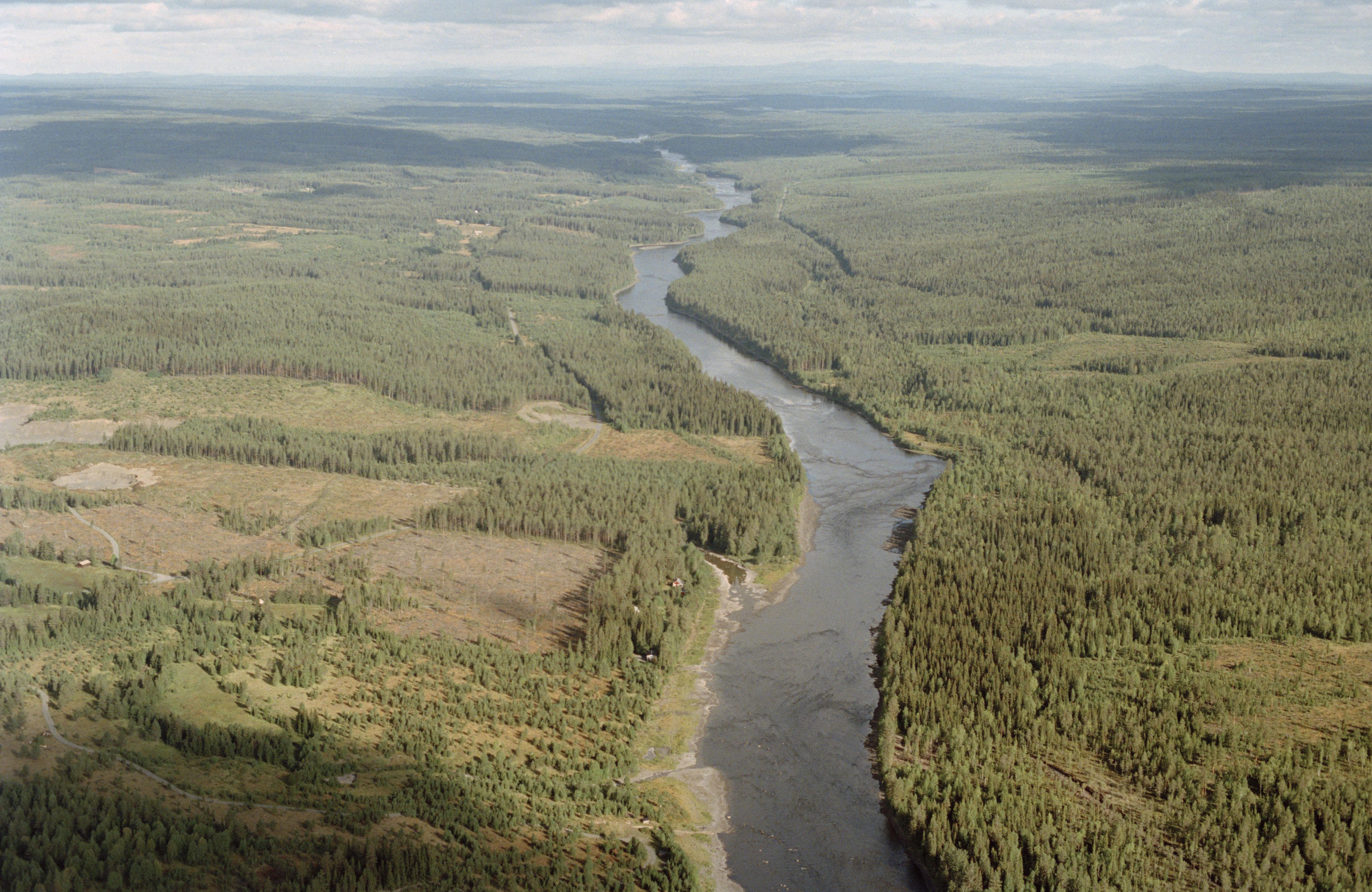 Beskrivning: Älven Hårkan som markerar gränsen mellan socknen Lit (till vänster) och Häggenås. Vid bildens mitt fångstgropssystem RAÄnr Lit 37:1 vid Holmviken. Till höger om bildens mitt Kvarnbäckens utlopp. I bildens övre del områdena Mångbodarna och Stenängesbrännan. Bilden är tagen mot (väderstreck): N