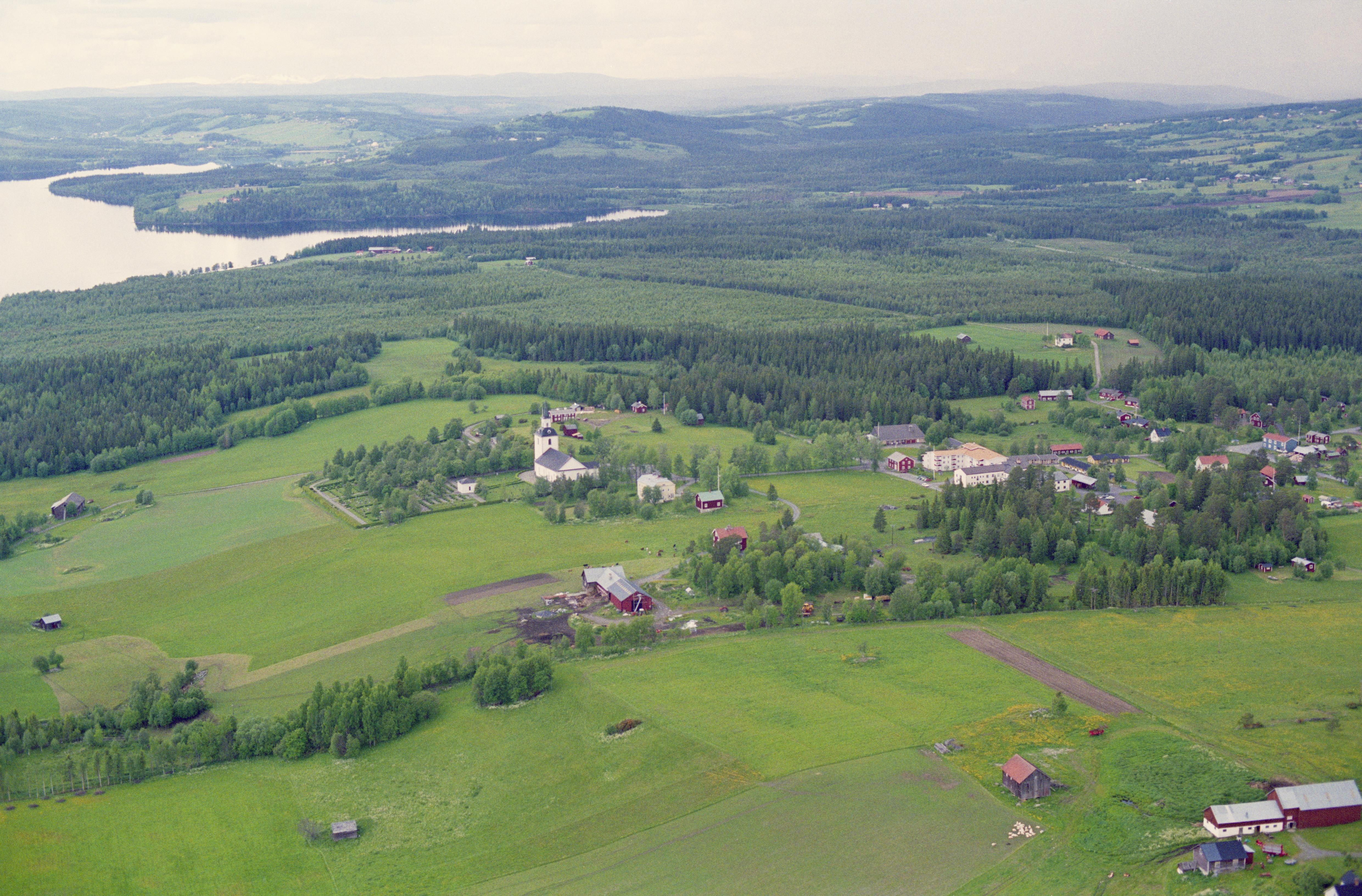 Beskrivning: Offerdals kyrkby vid Hällsjön. Offerdals kyrka över bildens mitt. Under bildens mitt fossil åker RAÄnr Offerdal 577:1 vid Edesån. Över bildens mitt ödesbölet Rösta med fossil åker RAÄnr Offerdal 85:1. Bilden är tagen mot (väderstreck): NV