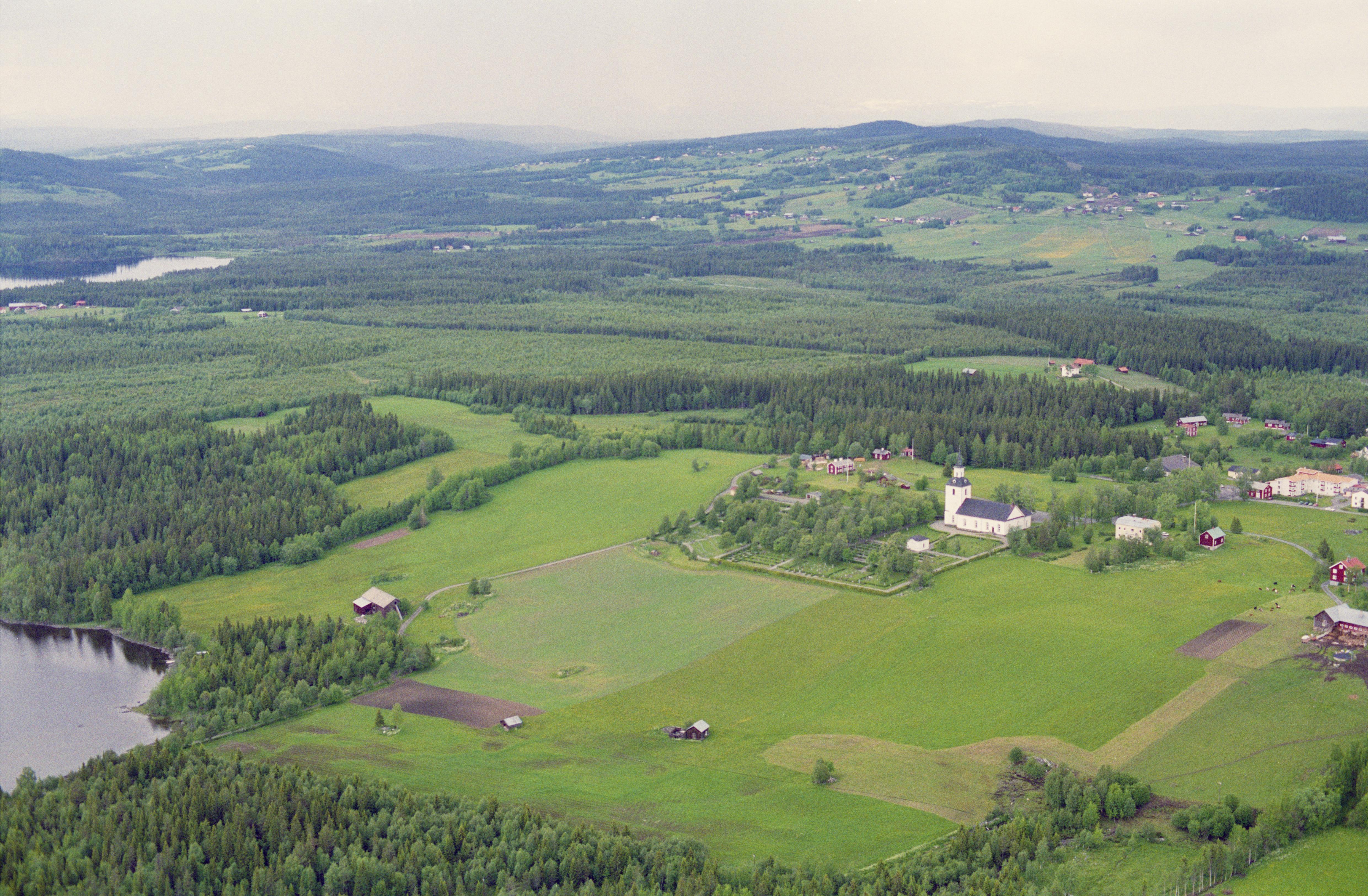 Beskrivning: Offerdals kyrkby vid Hällsjön. Offerdals kyrka över bildens mitt. Under bildens mitt fossil åker RAÄnr Offerdal 577:1 vid Edesån. Över bildens mitt ödesbölet Rösta med fossil åker RAÄnr Offerdal 85:1. Bilden är tagen mot (väderstreck): N