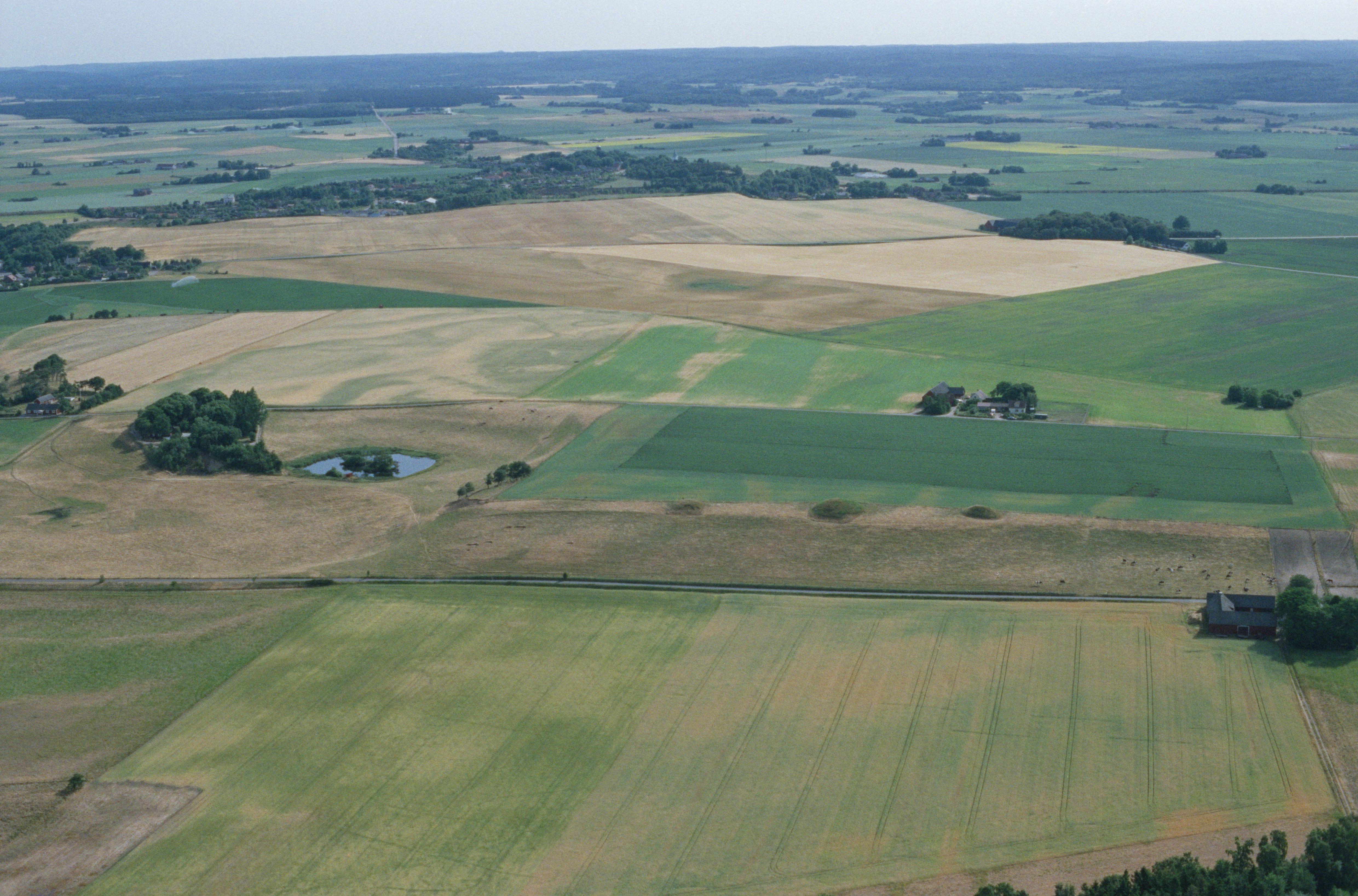 Beskrivning: Truedsgården. Gravhögar RAÄnr Eldsberga 2:1, 3:1, 4:1 m.fl. vid bildens mitt. Bilden är tagen mot (väderstreck): ONO