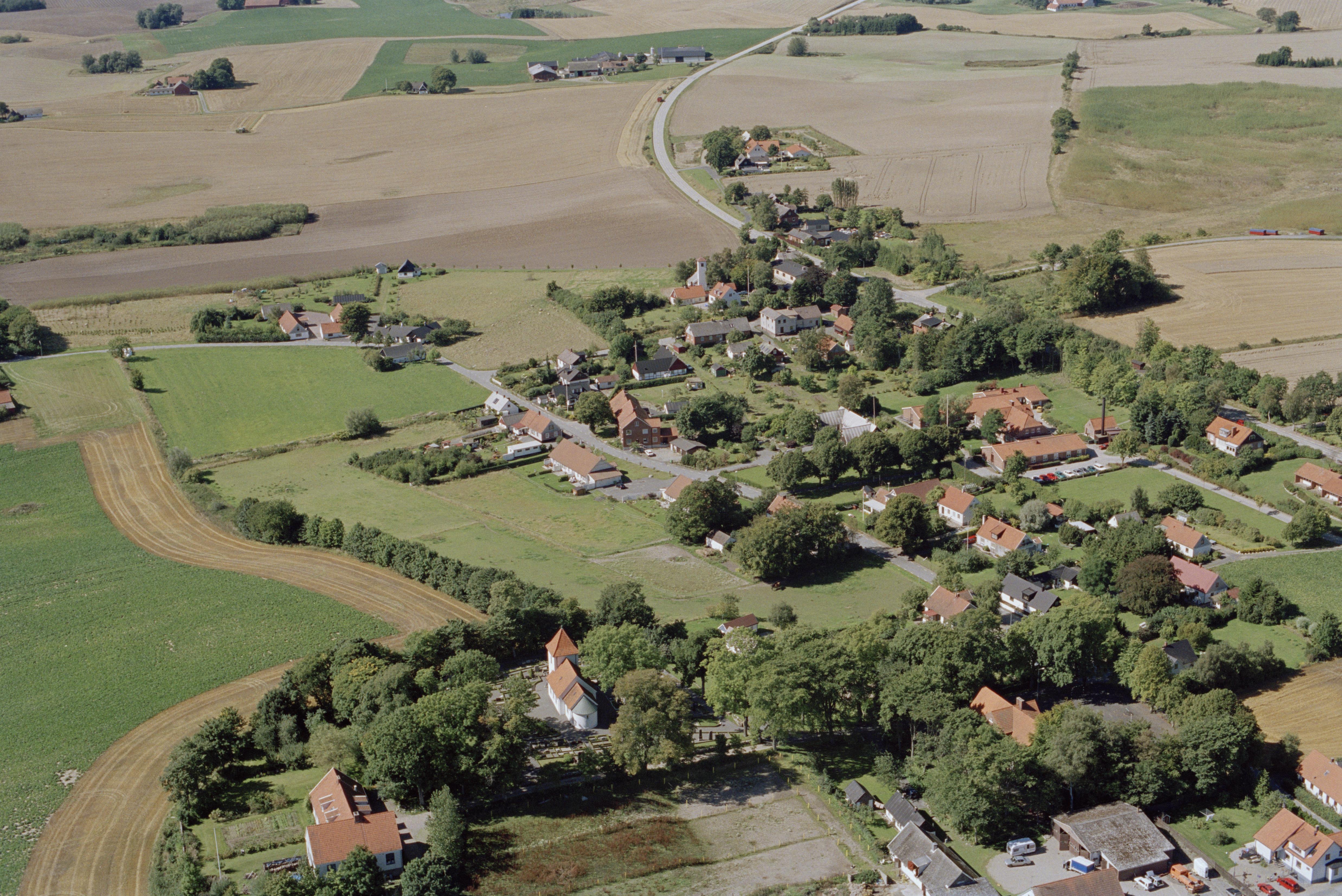 Beskrivning: Snårestads kyrka och kyrkby. Bilden är tagen mot (väderstreck): V