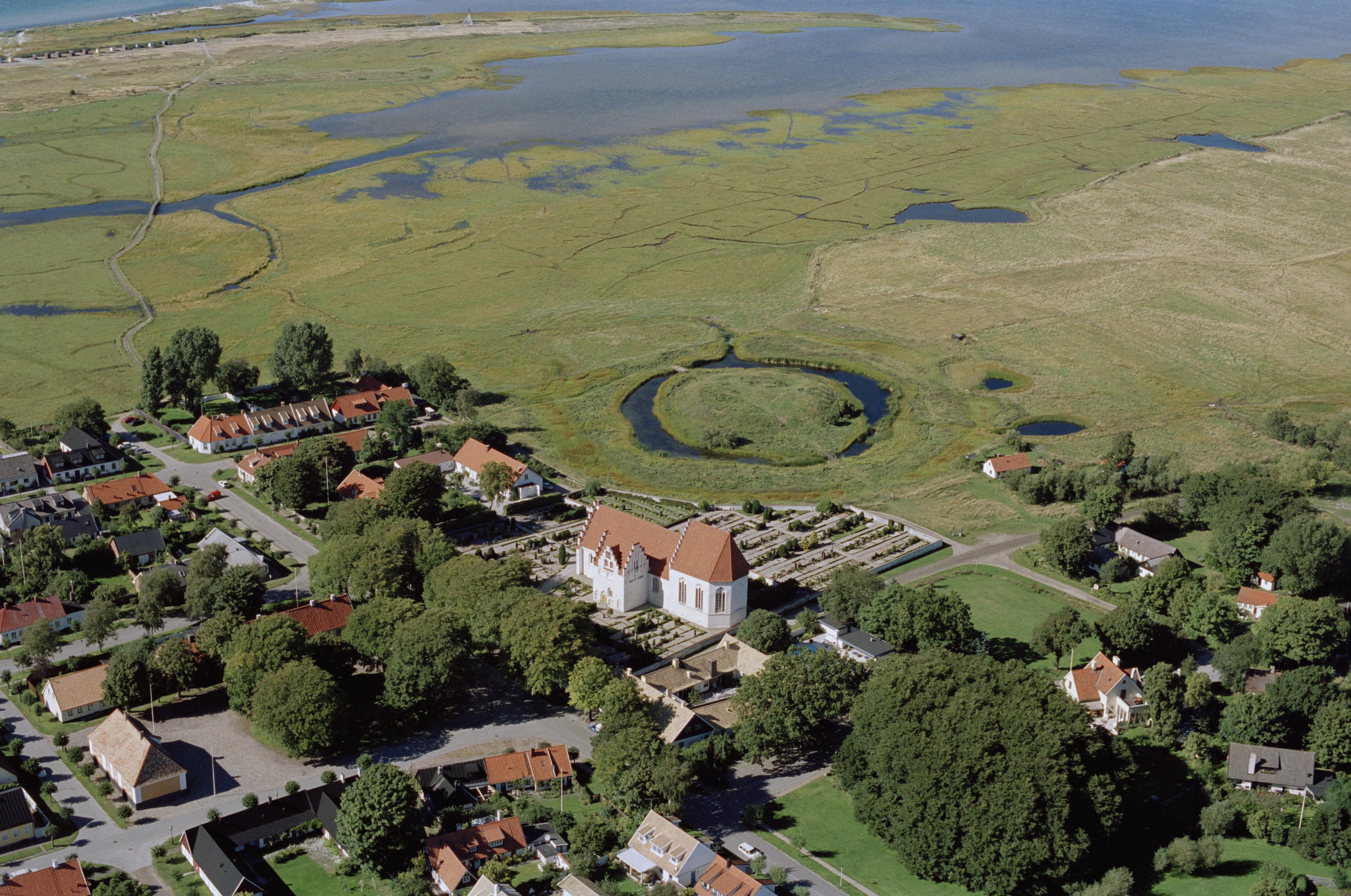 Beskrivning: Skanörs kyrka och Skanörs borgruin RAÄnr Skanör m. Falsterbo 1:1. Bilden är tagen mot (väderstreck): NV