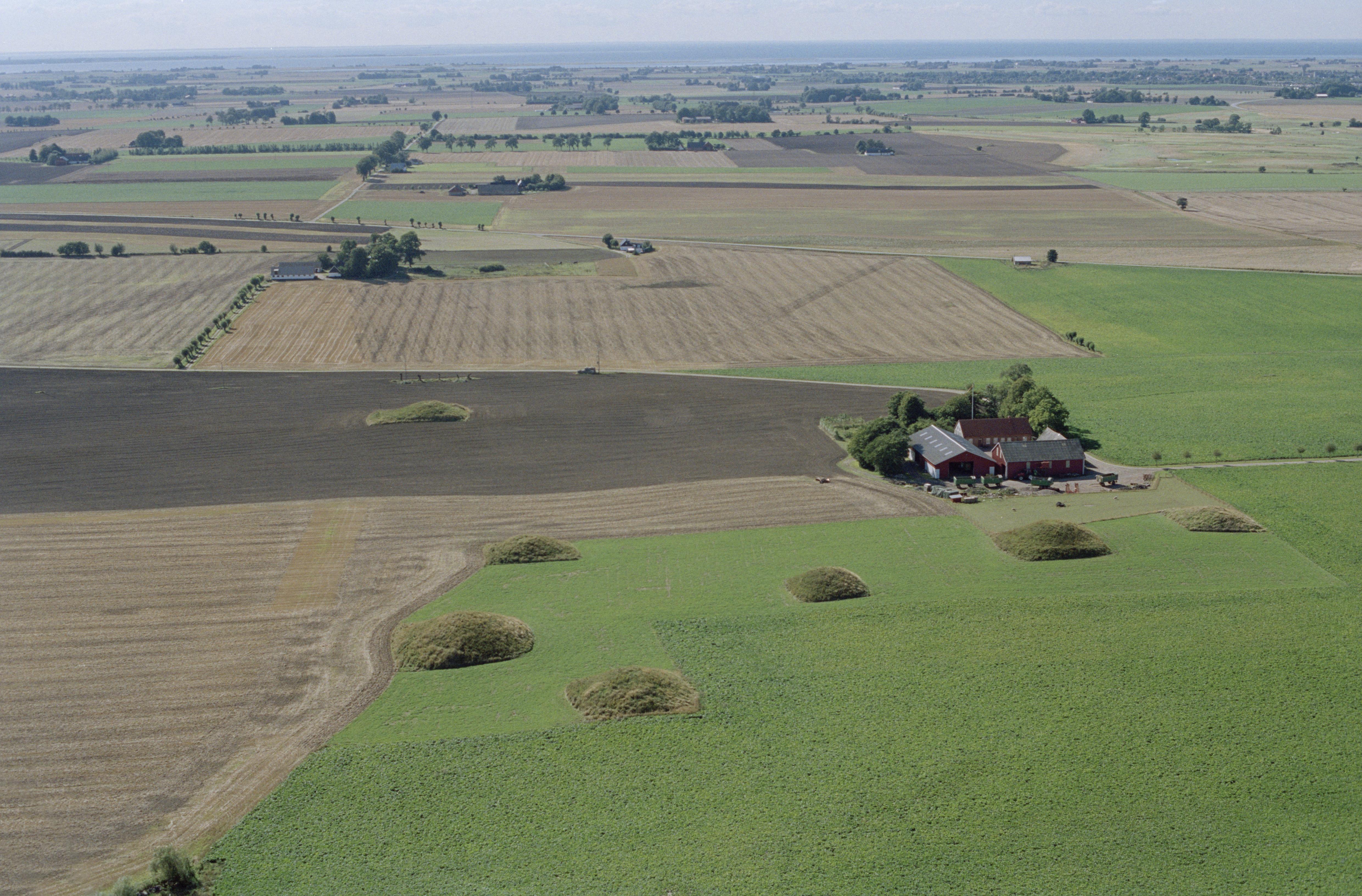 Beskrivning: Steglarps gravfält med flera bronsåldershögar: Sandhög RAÄnr Fuglie 9:1, Lillehög Fuglie 8:1, Storehög Fuglie 8:2, Grytehög Fuglie 11:1 m.fl. Högarna Fuglie 12:1 och 12:2 i bildens nedre del. Bilden är tagen mot (väderstreck): NV