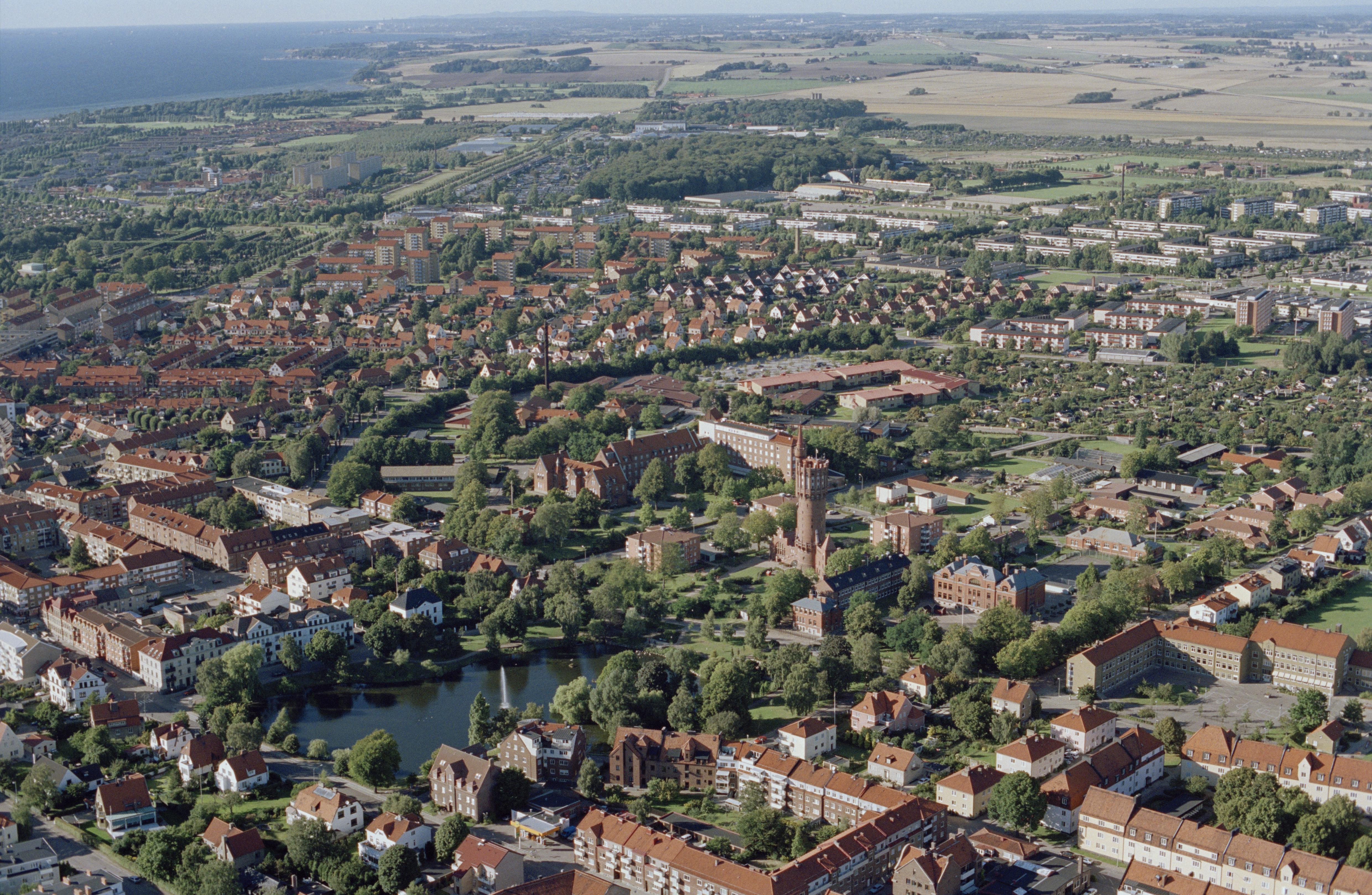 Beskrivning: Landskrona stad. Landskrona lasarett / sjukhus, Gamla vattentornet och stadslager RAÄnr Landskrona 14:1 i Sankt Olofs sjö vid bildens mitt. Bilden är tagen mot (väderstreck): V